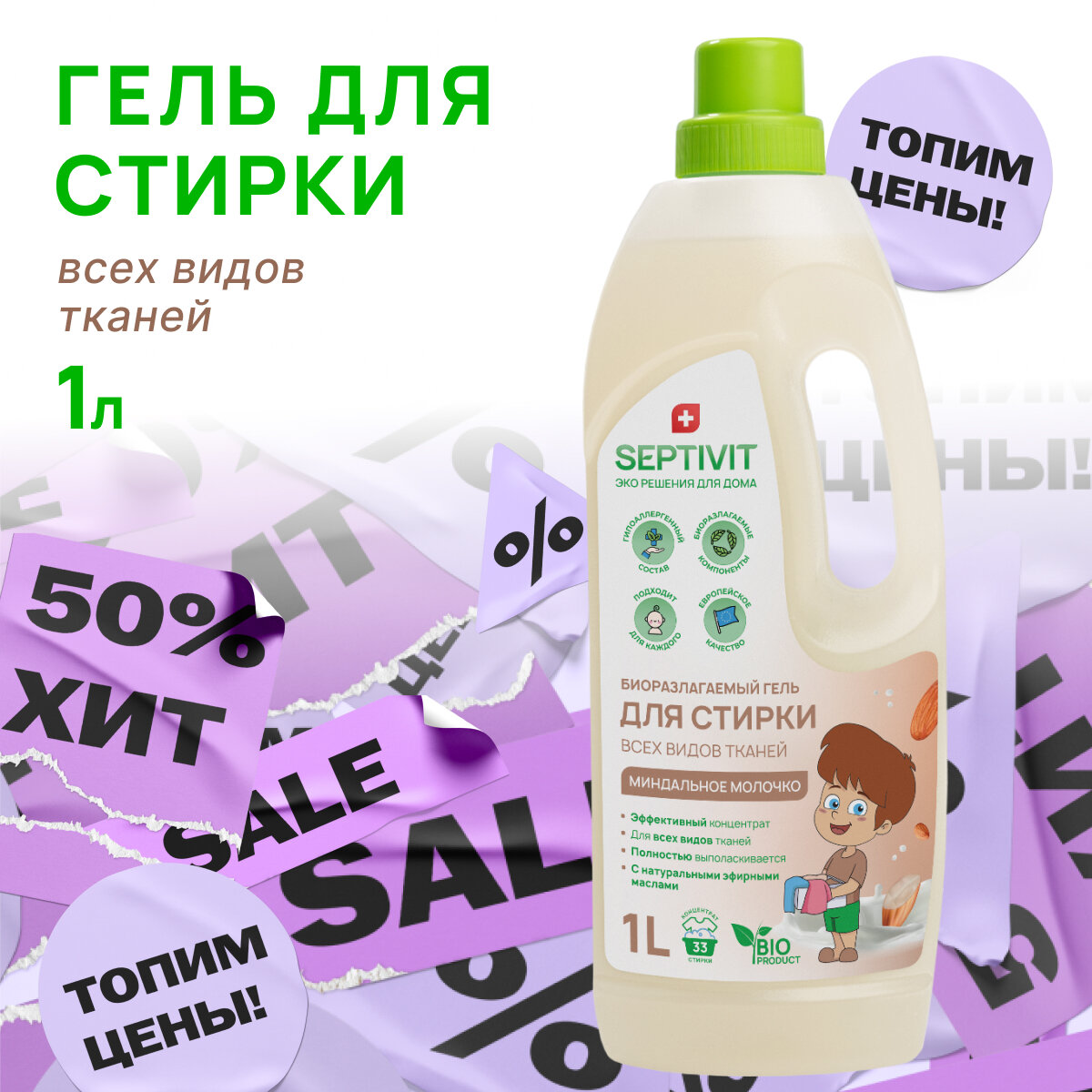 Купить Гель для стирки Septivit для всех видов ткани Миндальное молочко, 1л