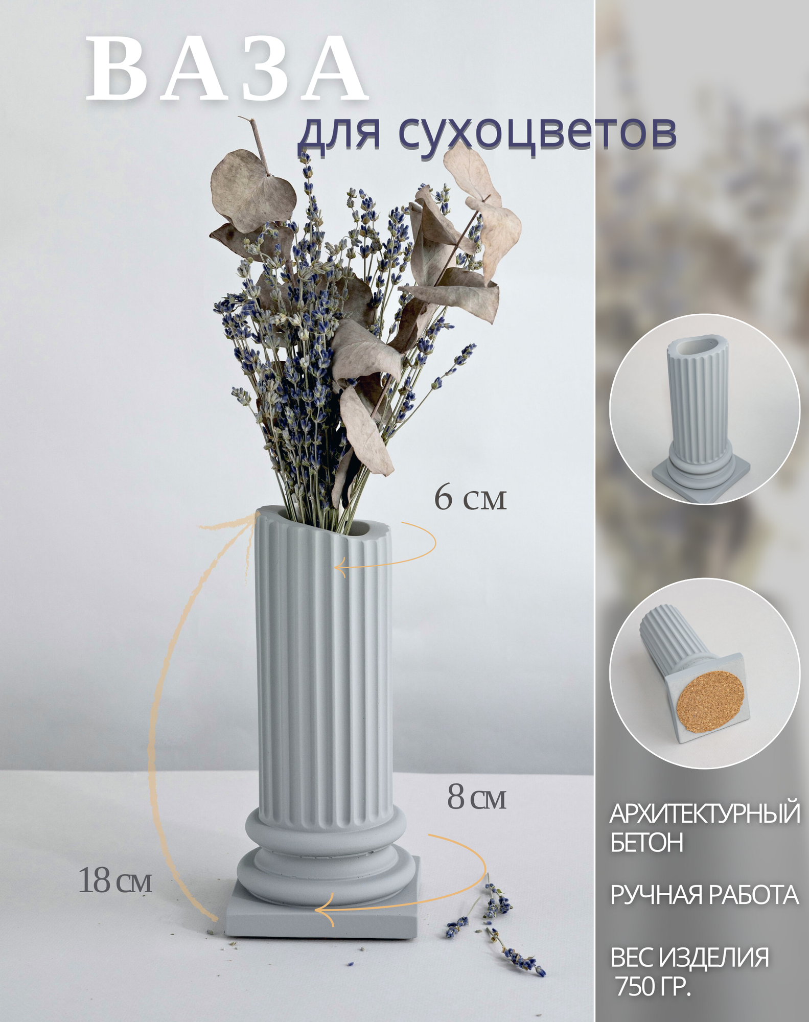 Ваза для сухоцветов из архитектурного бетона, DOLOMIT home, В003, 18 см, серая интересное: