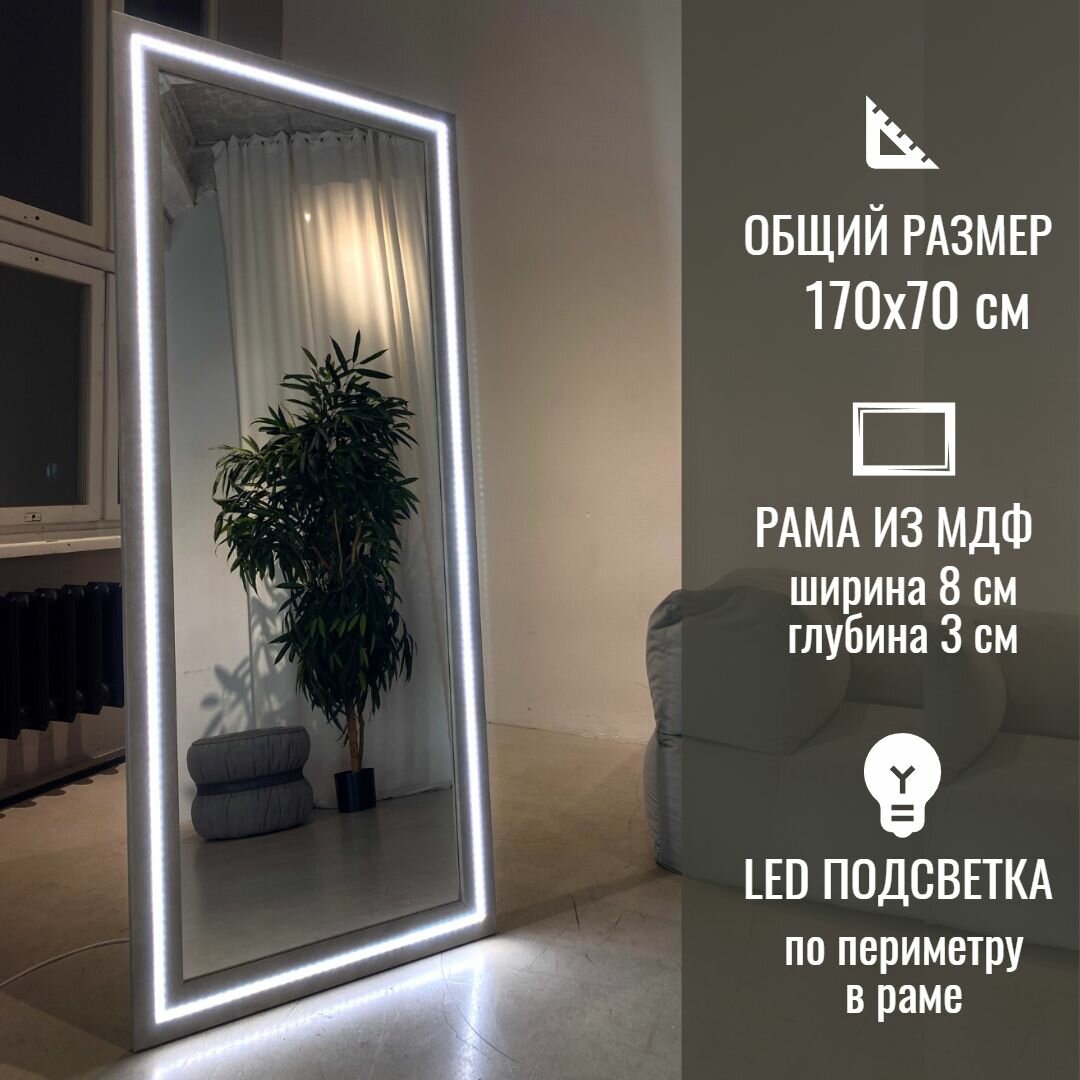 Интерьерное зеркало в полный рост 170х70 см с подсветкой. Цвет Лофт Белый. Зеркало настенное, напольное гримерное в раме