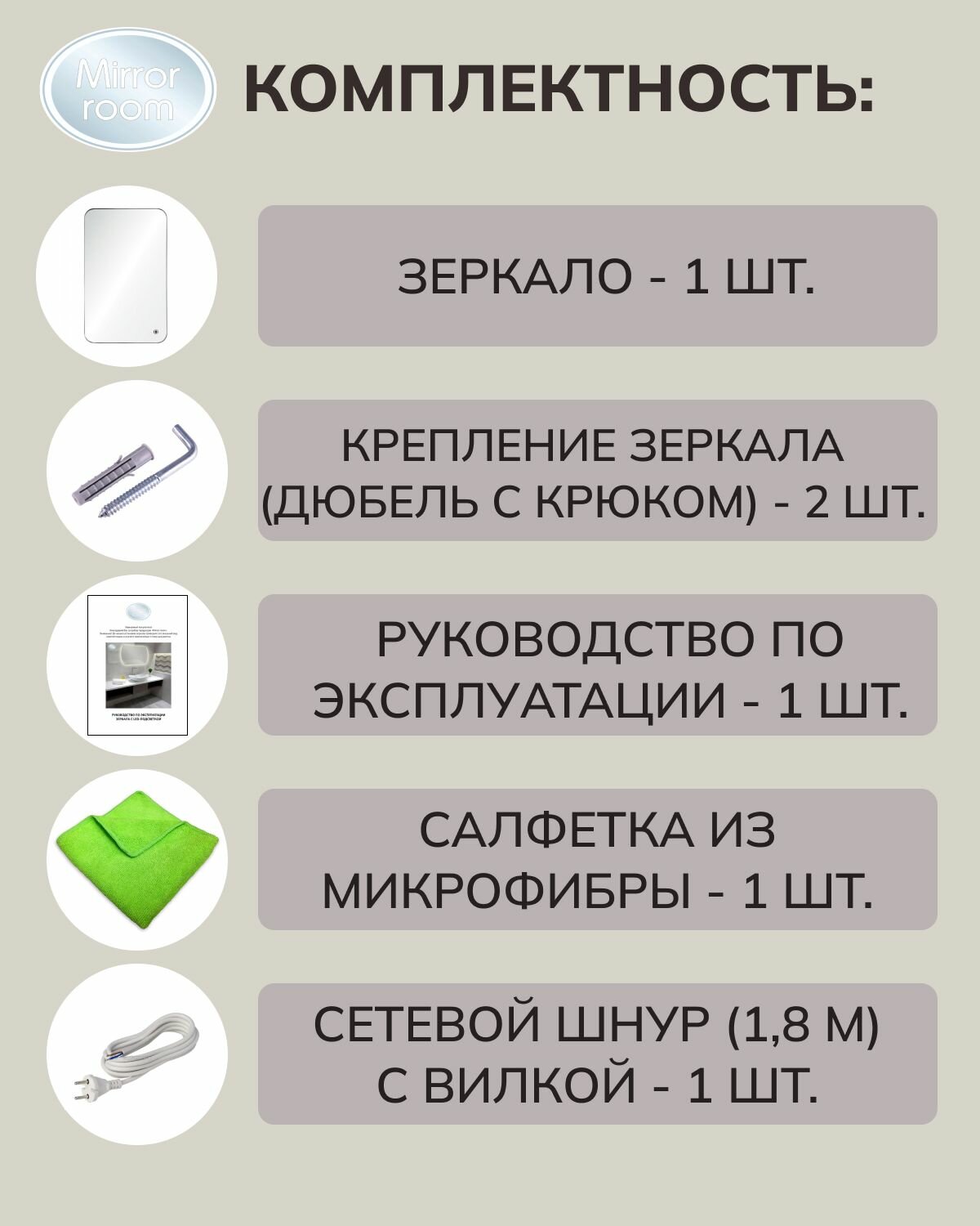 | Комплектация | зеркало, комплект крепежей, шнур с вилкой 1,5 м, салфетка из микрофибры, инструкция |