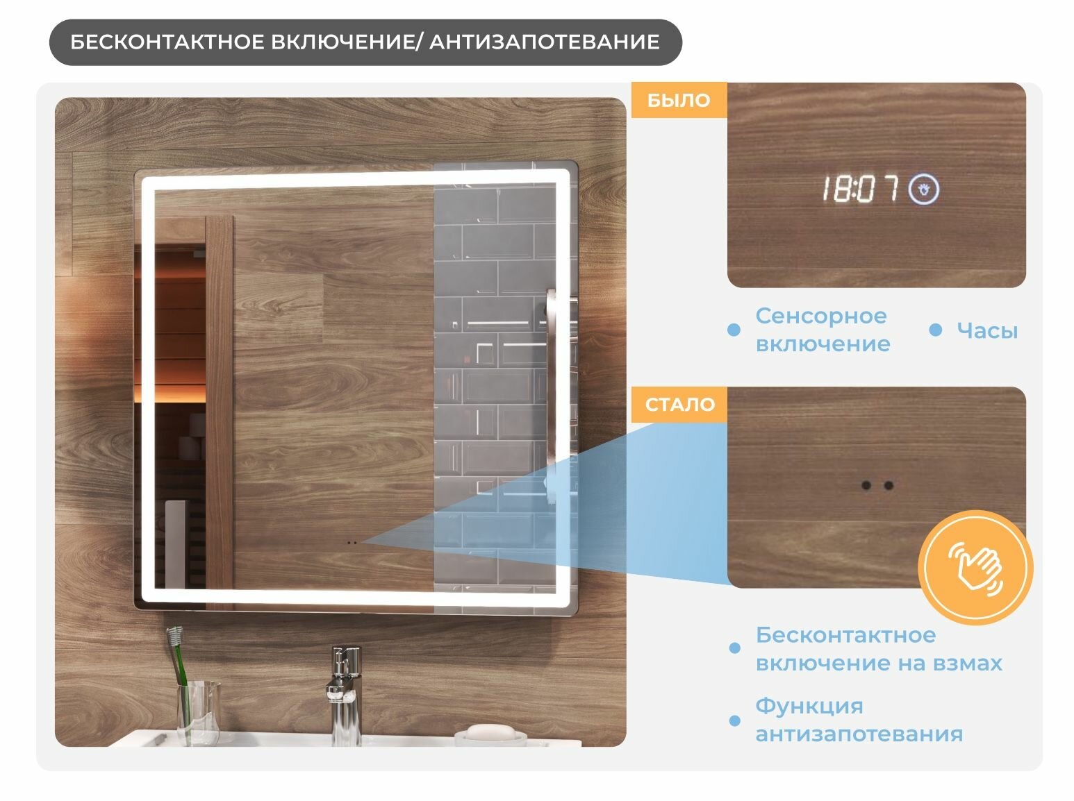| Особенности | без рамы, подсветка, полочка, с часами, сенсорный выключатель подсветки |