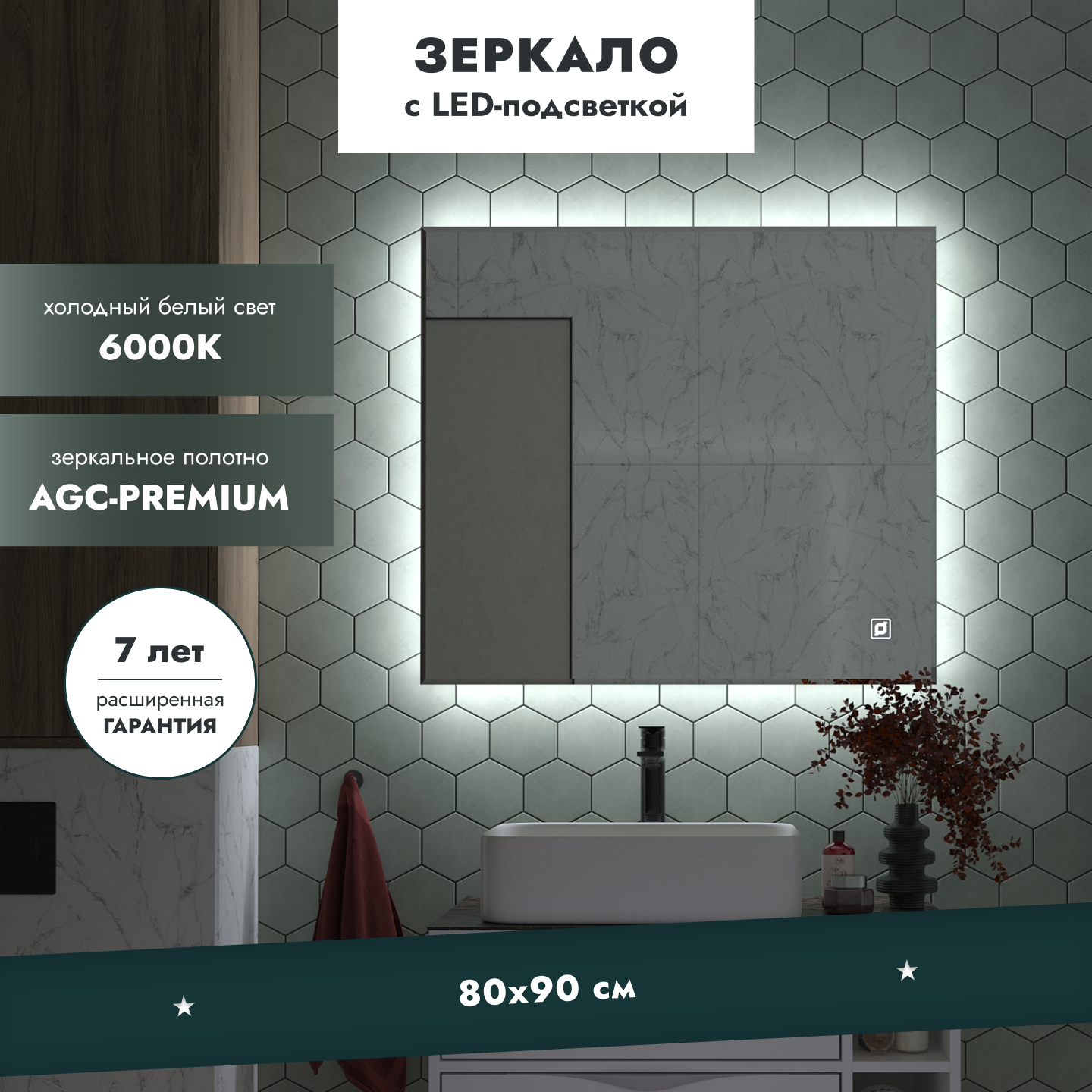 Купить Зеркало с подсветкой орвието 80х90 см для ванной холодный белый свет 6000К сенсорное управление