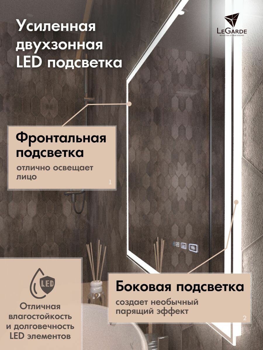 СохранитьСенсорное зеркало с подсветкой, подогревом и часами в ванную LeGarde Lester, прямоугольное 70х80 см, настенное, регулировка яркости интересное: