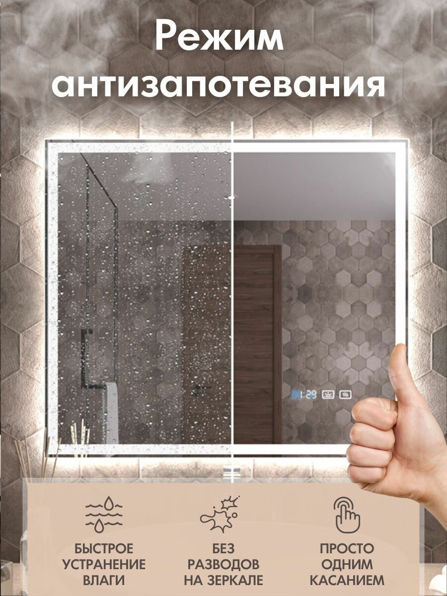 Купить Сенсорное зеркало с подсветкой, подогревом и часами в ванную LeGarde Lester, прямоугольное 70х80 см, настенное, регулировка яркости