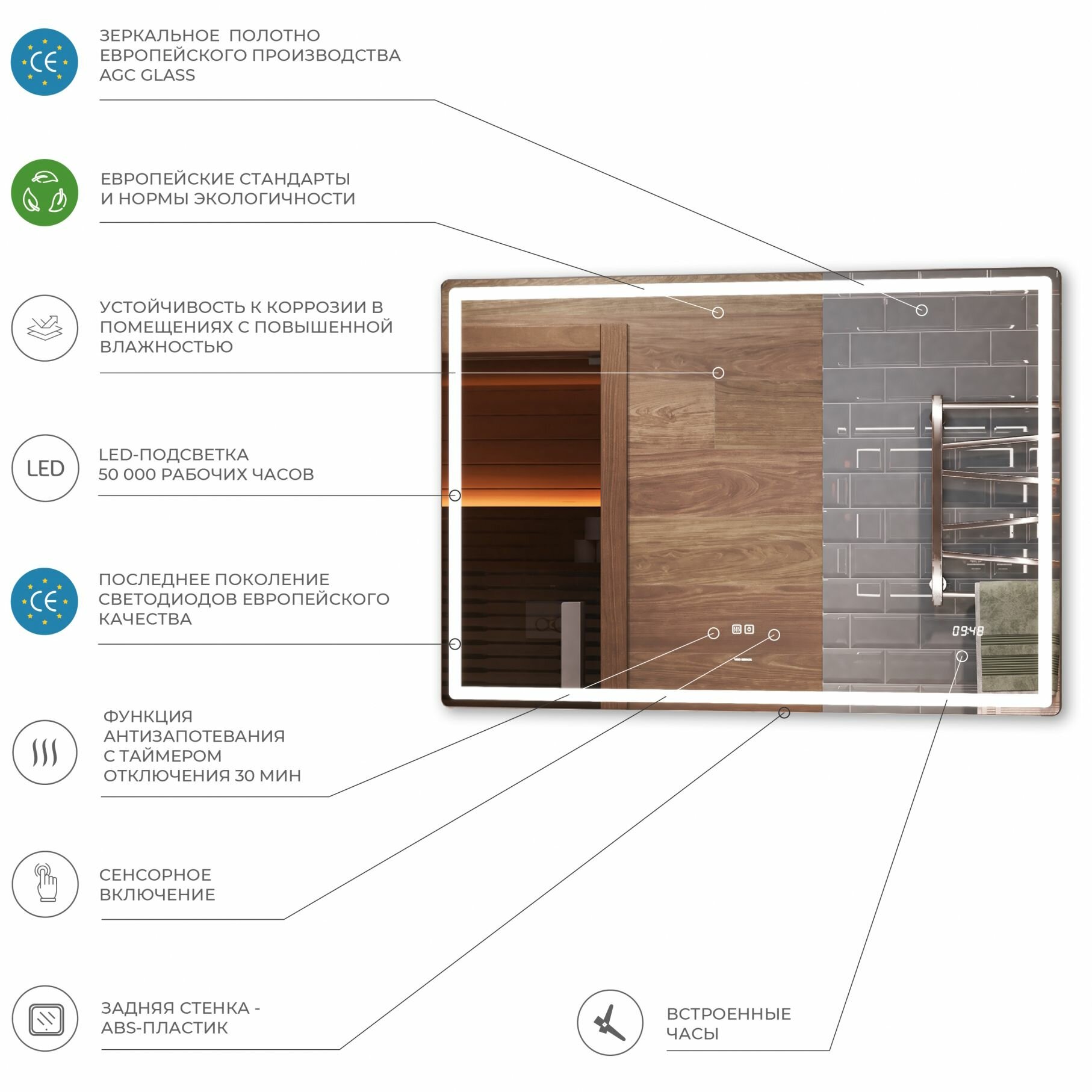 | Особенности | без рамы, без увеличения, подогрев, подсветка, с часами, сенсорный выключатель подсветки |