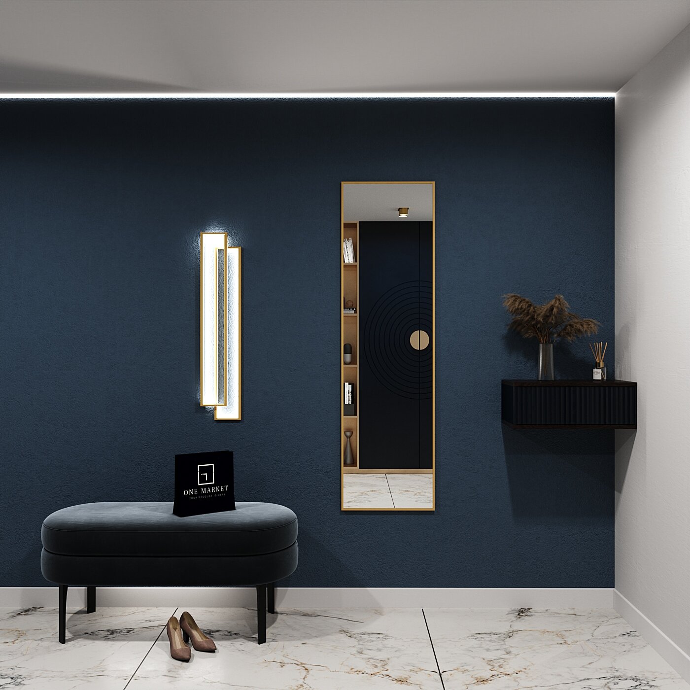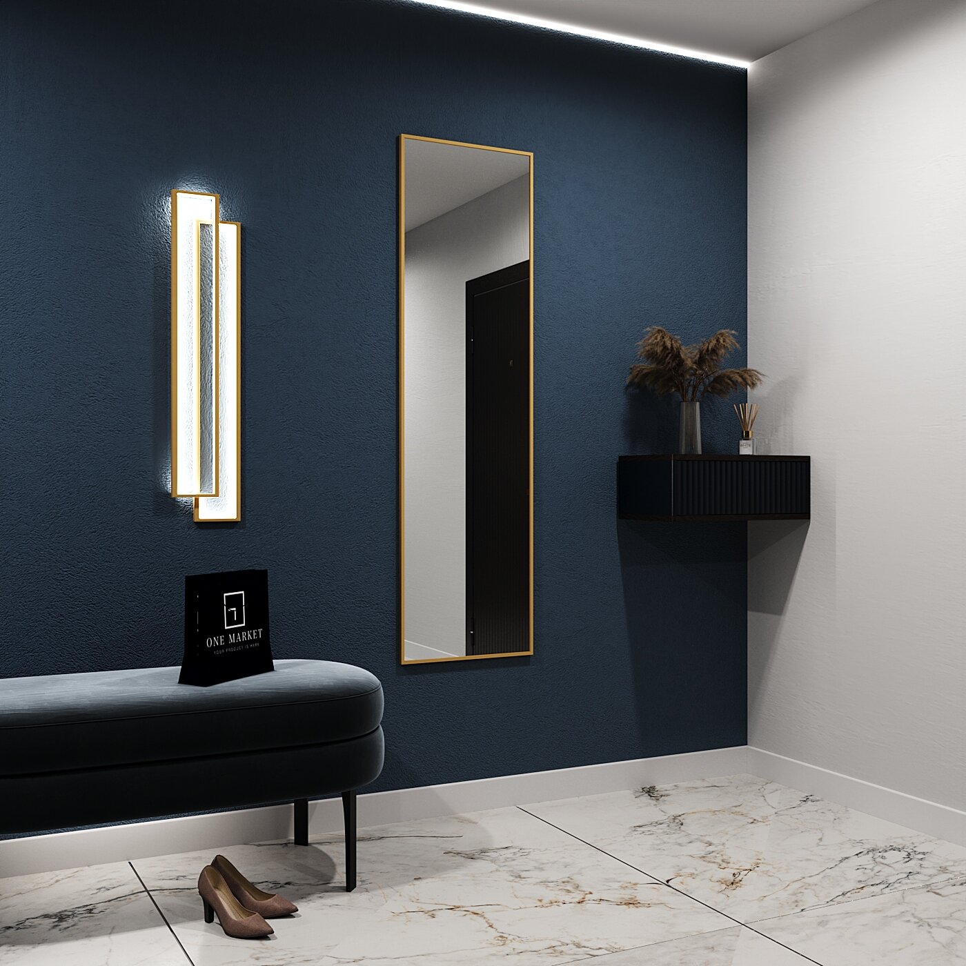 Зеркало настенное в алюминиевой раме ONE MARKET , 200х60 см. Золото