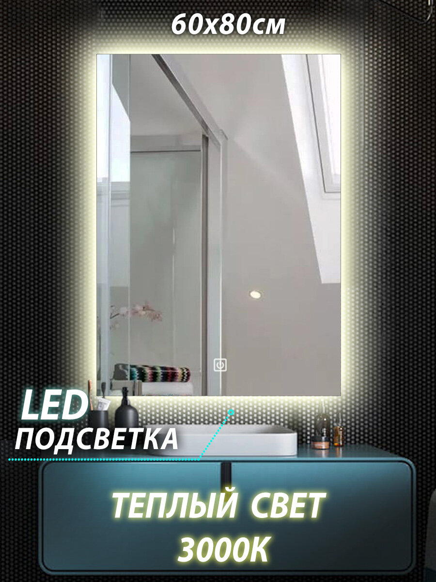 Зеркало настенное для ванной КерамаМане 80*60 см со светодиодной сенсорной тёплой подсветкой 3000 К