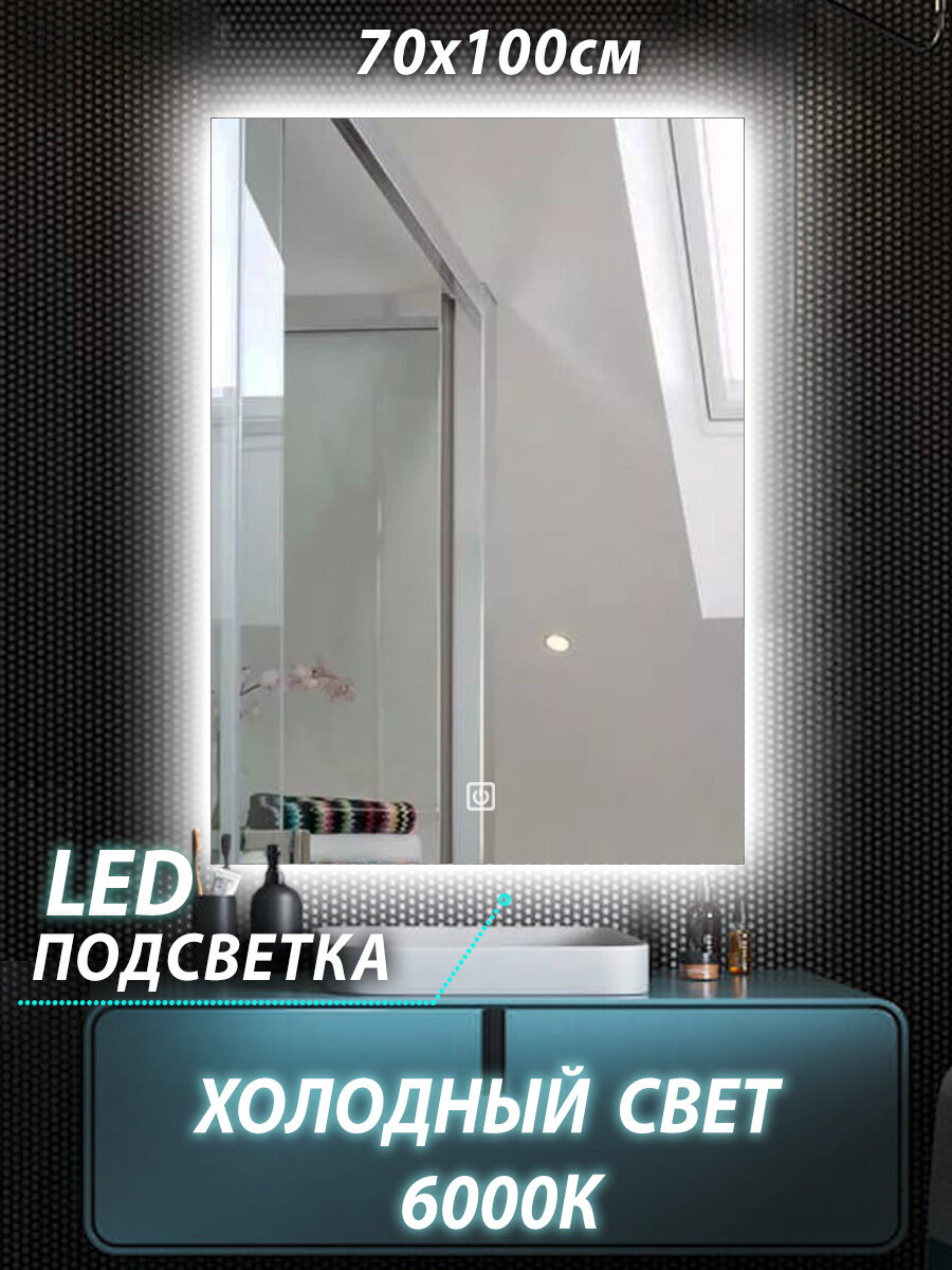 Зеркало настенное для ванной КерамаМане 70*100 см с холодной подсветкой 6000 К с сенсорной кнопкой