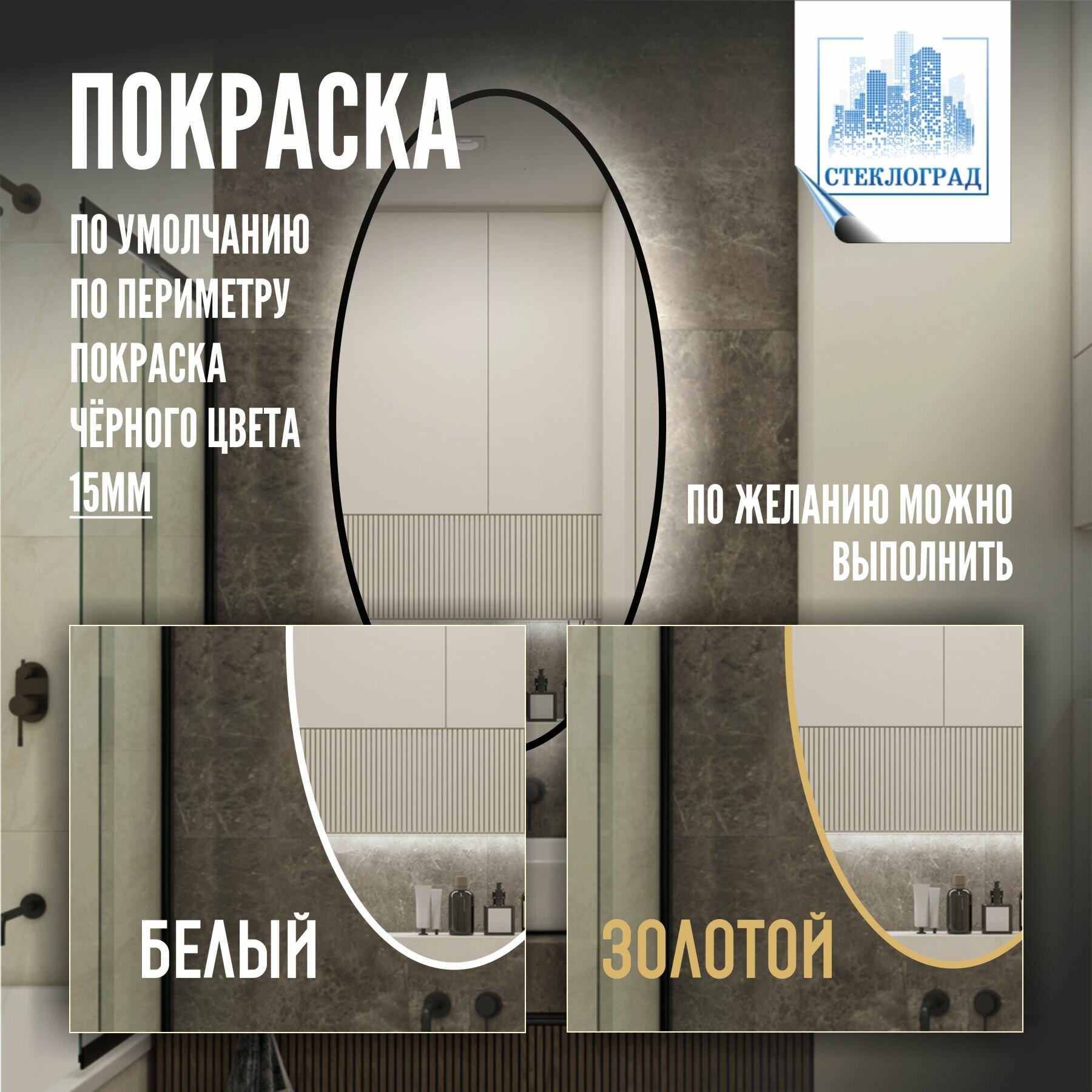 Зеркало с подсветкой полукруглое левое 50*100см настенное для ванной + покраска по периметру