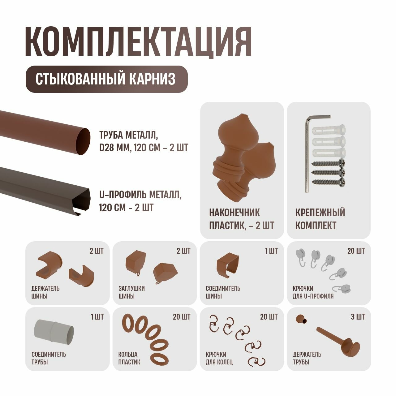 | Комплектация | В комплект входит: - труба 28 мм - 1 шт.- кронштейн из ударопрочного пластика - 3 шт.- наконечник из пластика - 2 шт.- кольца с крючками - 20 шт.- крючки для шины - 20 шт.- U-шина для 2-го ряда - 1 шт.- заглушка для U-шины - 2 шт.- кронштейн для U-шины - 2 шт.- саморезы. |