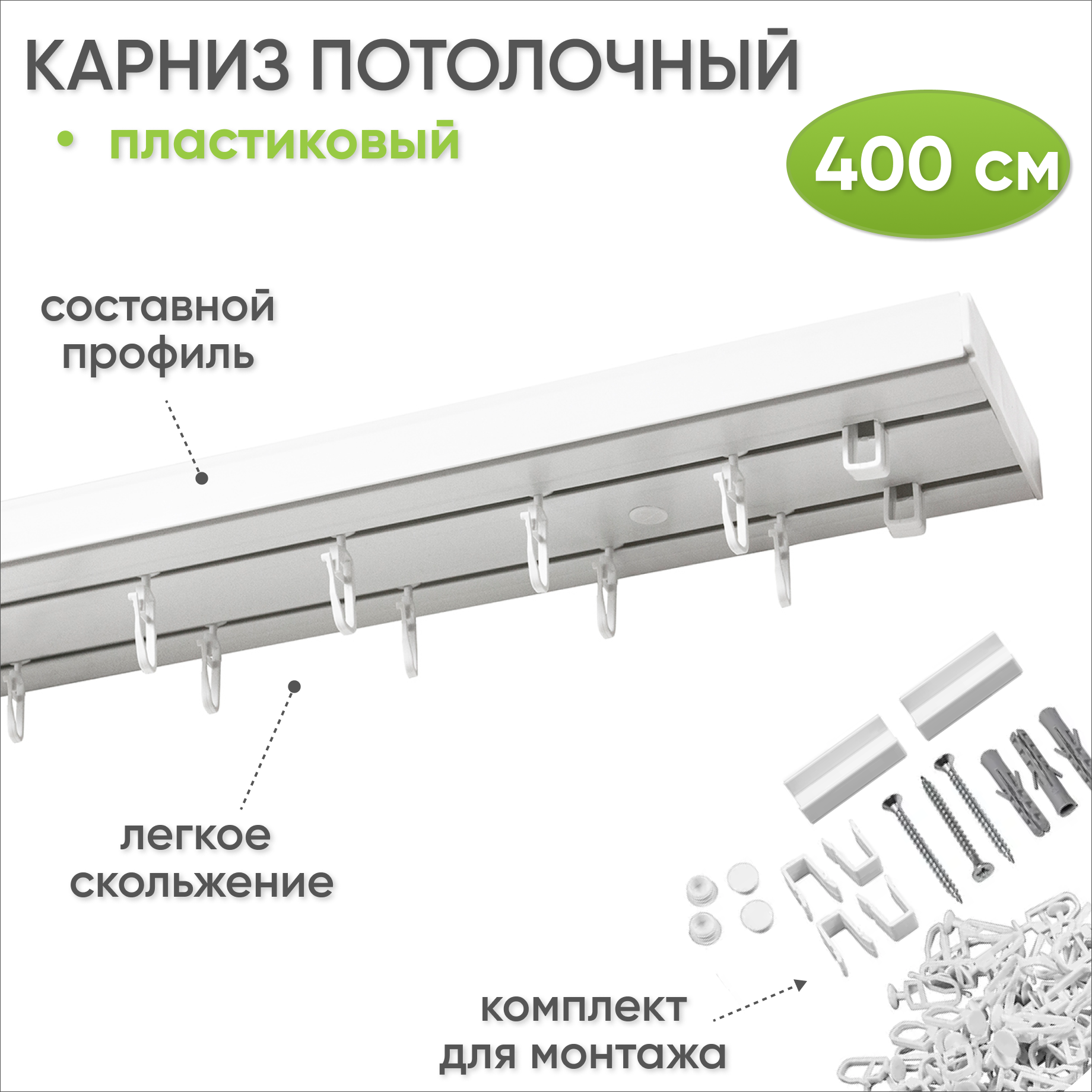 | Комплектация | пластиковая шина, бегунки, крючки, стопоры, заглушки, монтажный набор (дюбели и саморезы) |