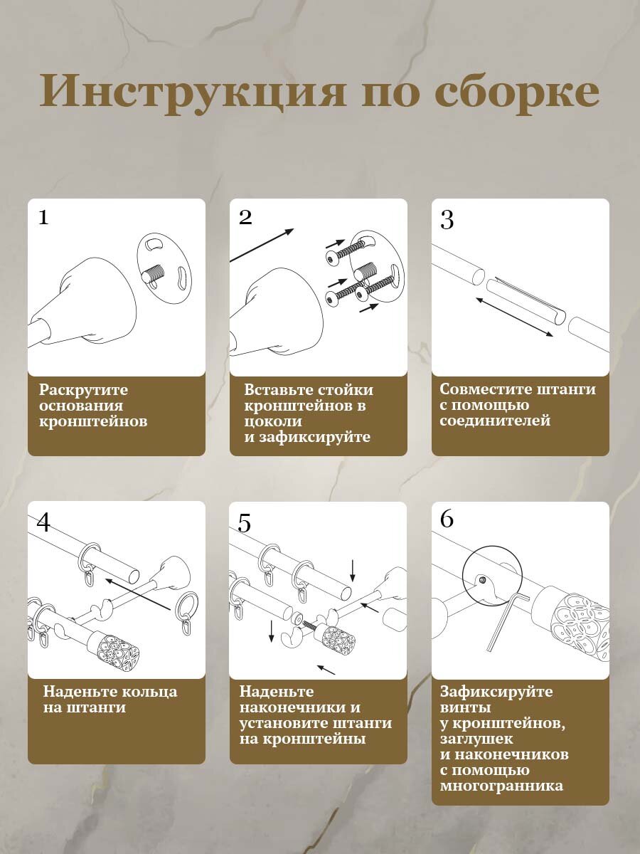 | Комплектация | Штанга длина 118 см - 4 шт;Кронштейн двойной 21см 19мм/19мм - 3 шт;кольца на карниз - 48 шт, крючки для колец - 48 шт;наконечник на карниз - 2 шт, адаптер - 2 шт, заглушки на карниз - 2 шт;комплект крепежей, инструкция по установке |