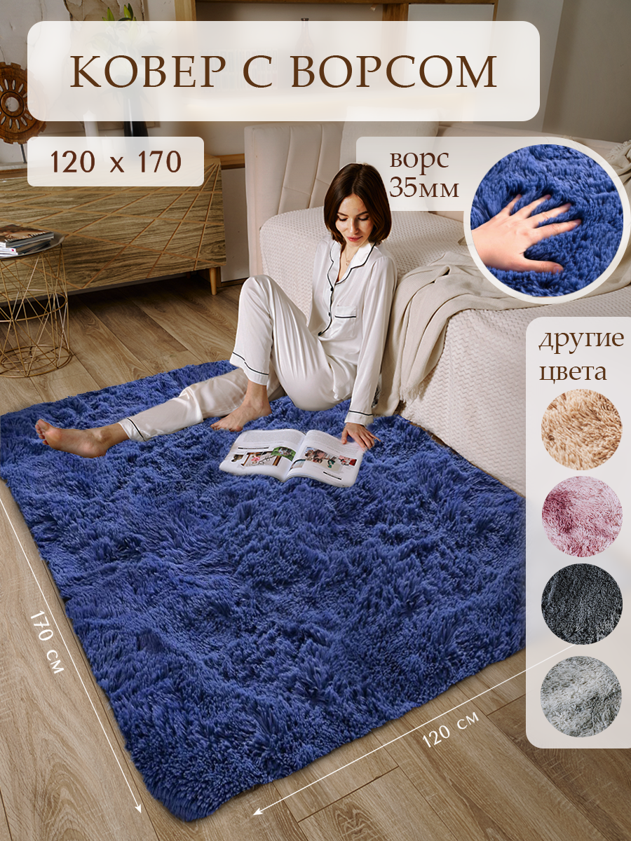 Купить Ковер на пол с длинным ворсом меховой 120х170 синий ковер комнатный, прикроватный, пушистый в комнату, спальню, гостиную, прихожую