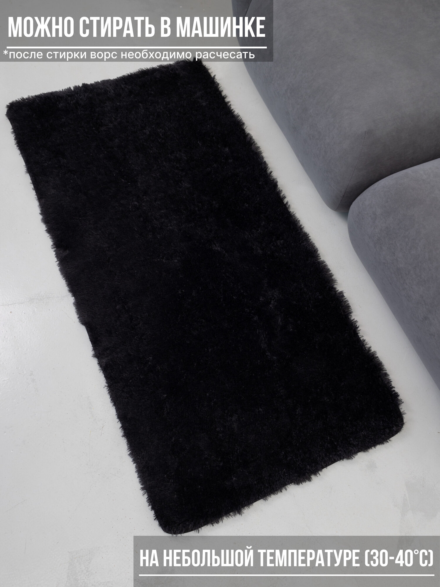 Ковер черный пушистый с длинным ворсом, коврик в детскую, гостиную, спальню, игровую, ванную комнату, прикроватный коврик 100*200см