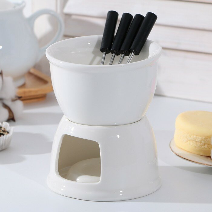 Набор для фондю "Глянец", 6 предметов: чаша 400 мл, подставка, 4 шпажки, керамика, белый