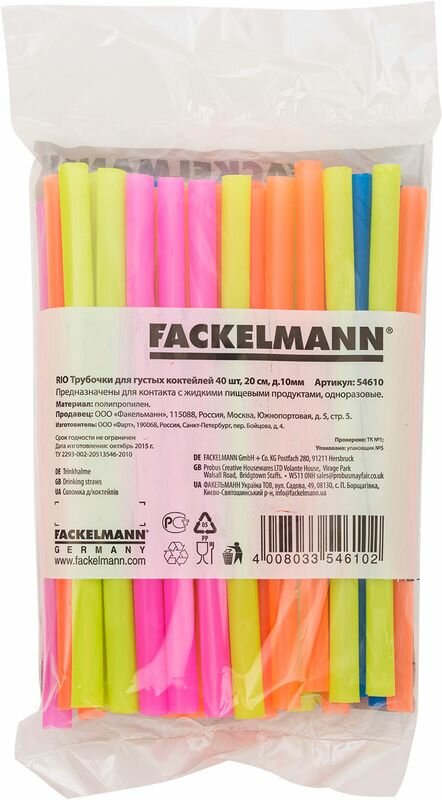 FACKELMANN Трубочки для густых коктейлей диаметр - 10 мм, длина - 20 см, 40 шт, соломинки для смузи, для соков с мякотью