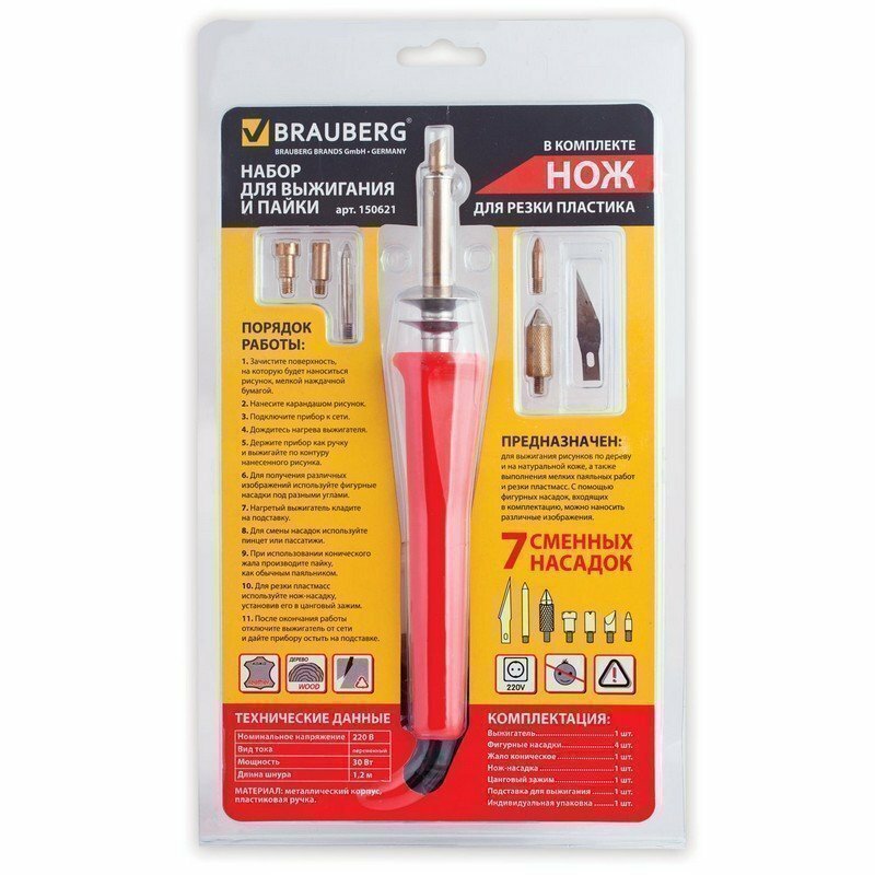 Набор для выжигания и пайки BRAUBERG, 6 насадок + нож для резки пластика, красный, 150621, 150621