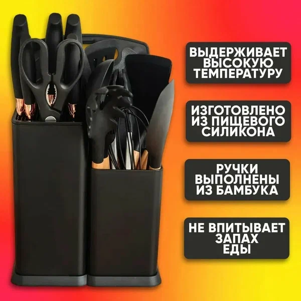 Поварешки кухонные набор Kitchenware Set 19 предметов силикон бамбук черный интересное: