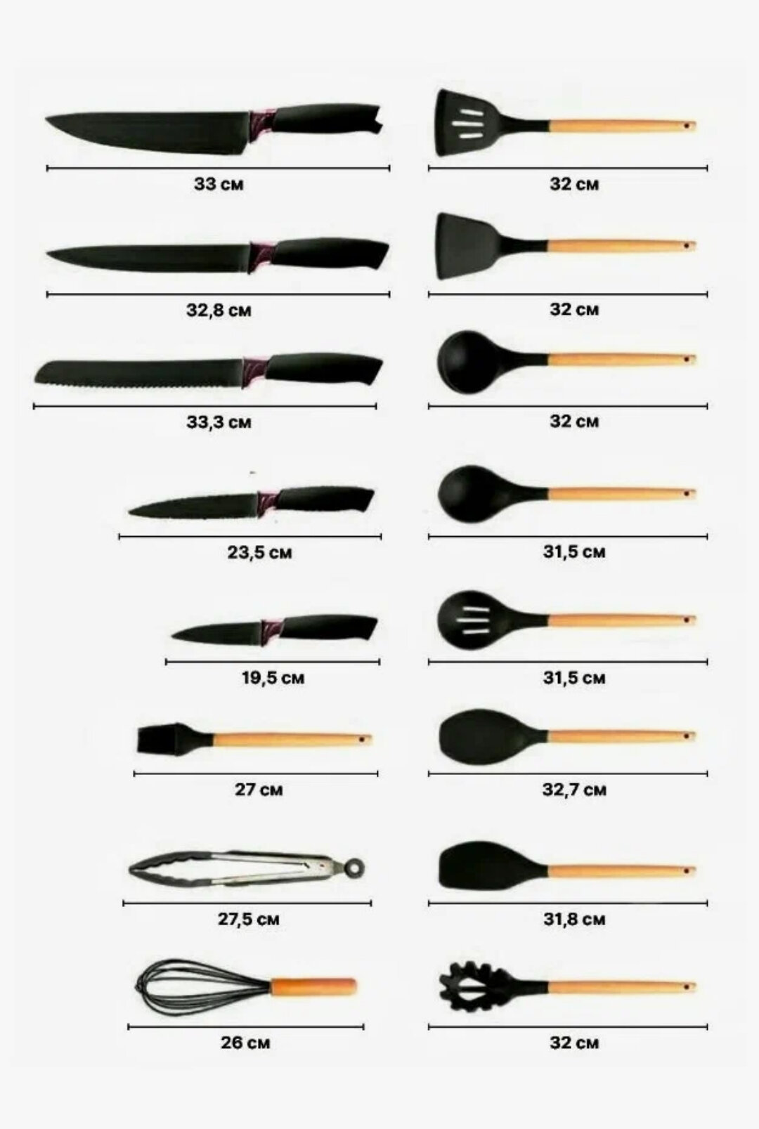 | Комплектация | венчик, вилка поварская, картофелемялка, кисть кулинарная, ложка для спагетти, ложка поварская, ложка-дуршлаг, лопатка, лопатка для блинов, нож для пиццы, половник, шумовка, щипцы, нож для стейка, нож обвалочный, разделочная доска, хлебный нож |