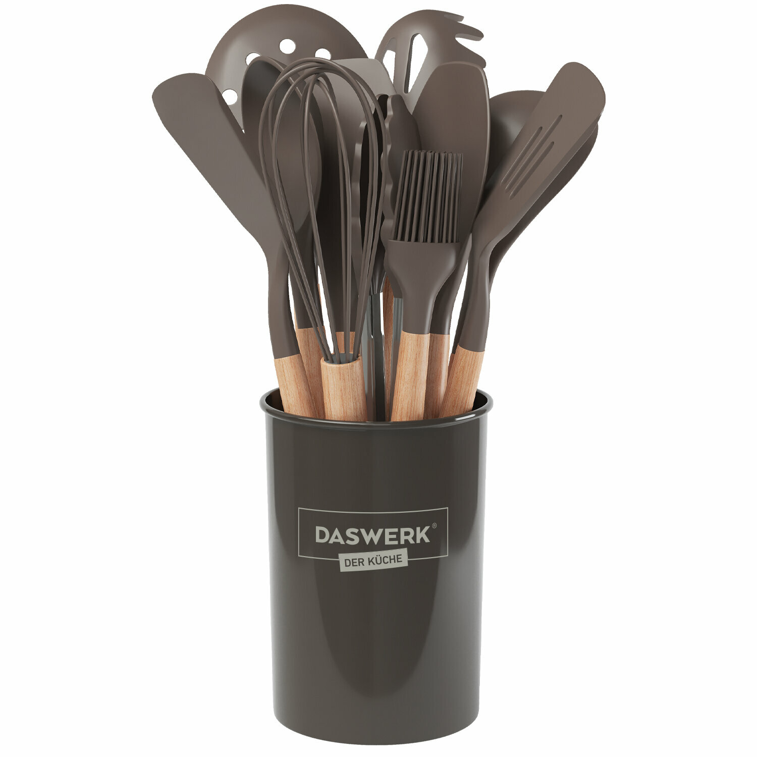 Набор силиконовых кухонных принадлежностей с деревянными ручками 12 в 1, серо-коричневый, DASWERK, 608195