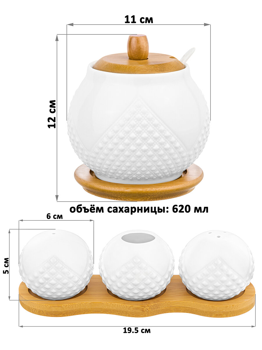 | Дополнительная информация | Набор 4 предмета - Сахарница 11х11х12 см, 620 мл, с ложкой и деревянной крышкой, на деревянной подставке + Вазочка под зубочистки + набор для специй 3 предмета, 19,5х7х6 см - в наборе, 6х6х5 см, 75 мл - каждая, на деревянной подставке. Можно мыть в ПММ без бамбуковых частей. |