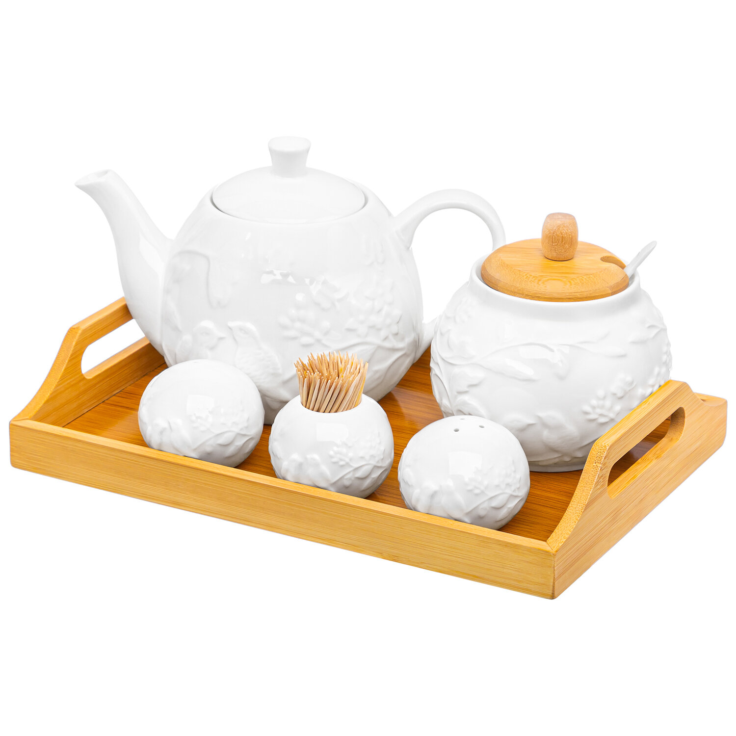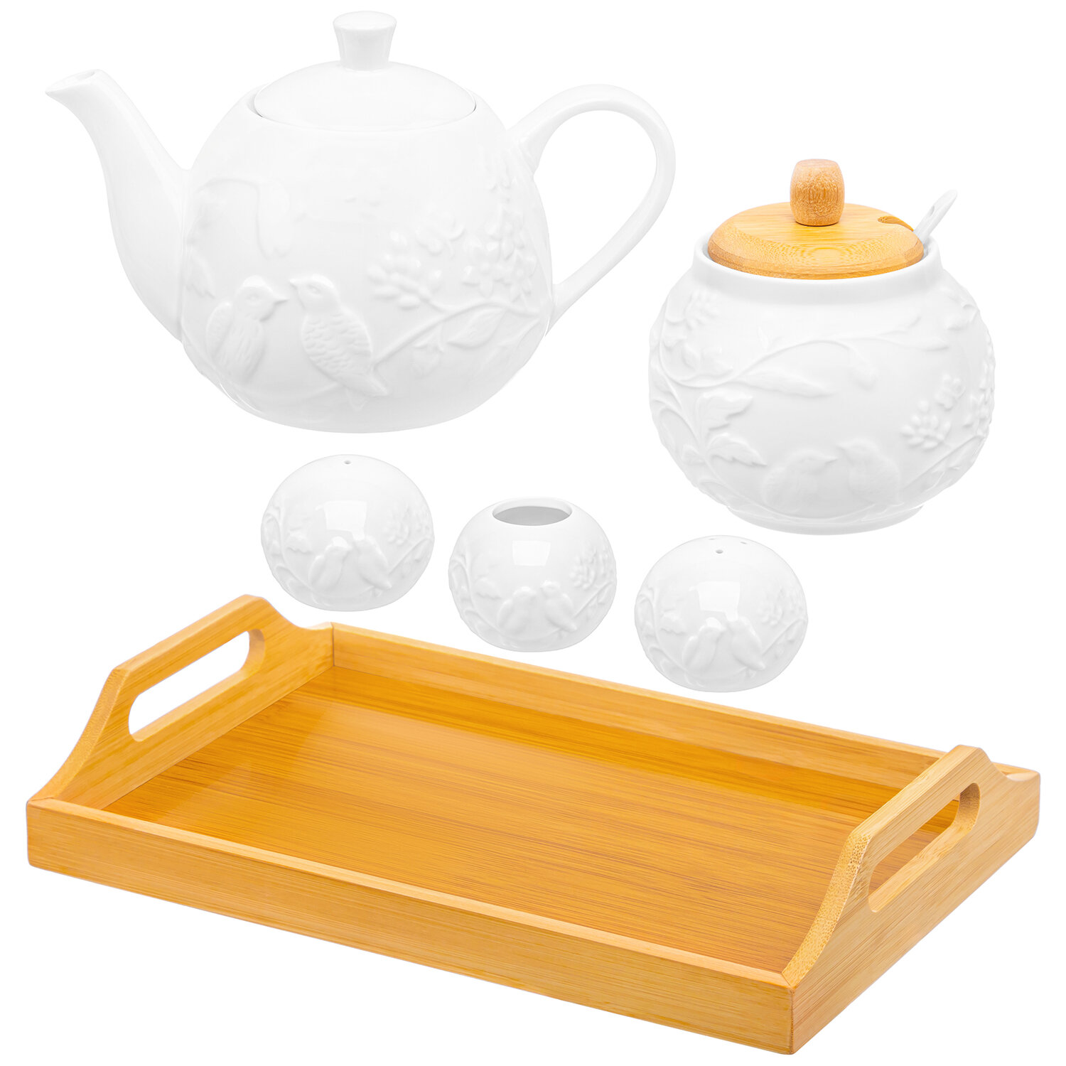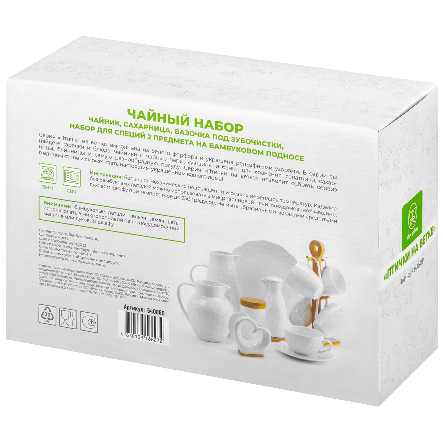 Купить Набор - чайник, сахарница, вазочка под зубочистки, перечница, солонка Elan Gallery Птички на ветке, на деревянном подносе с ручками