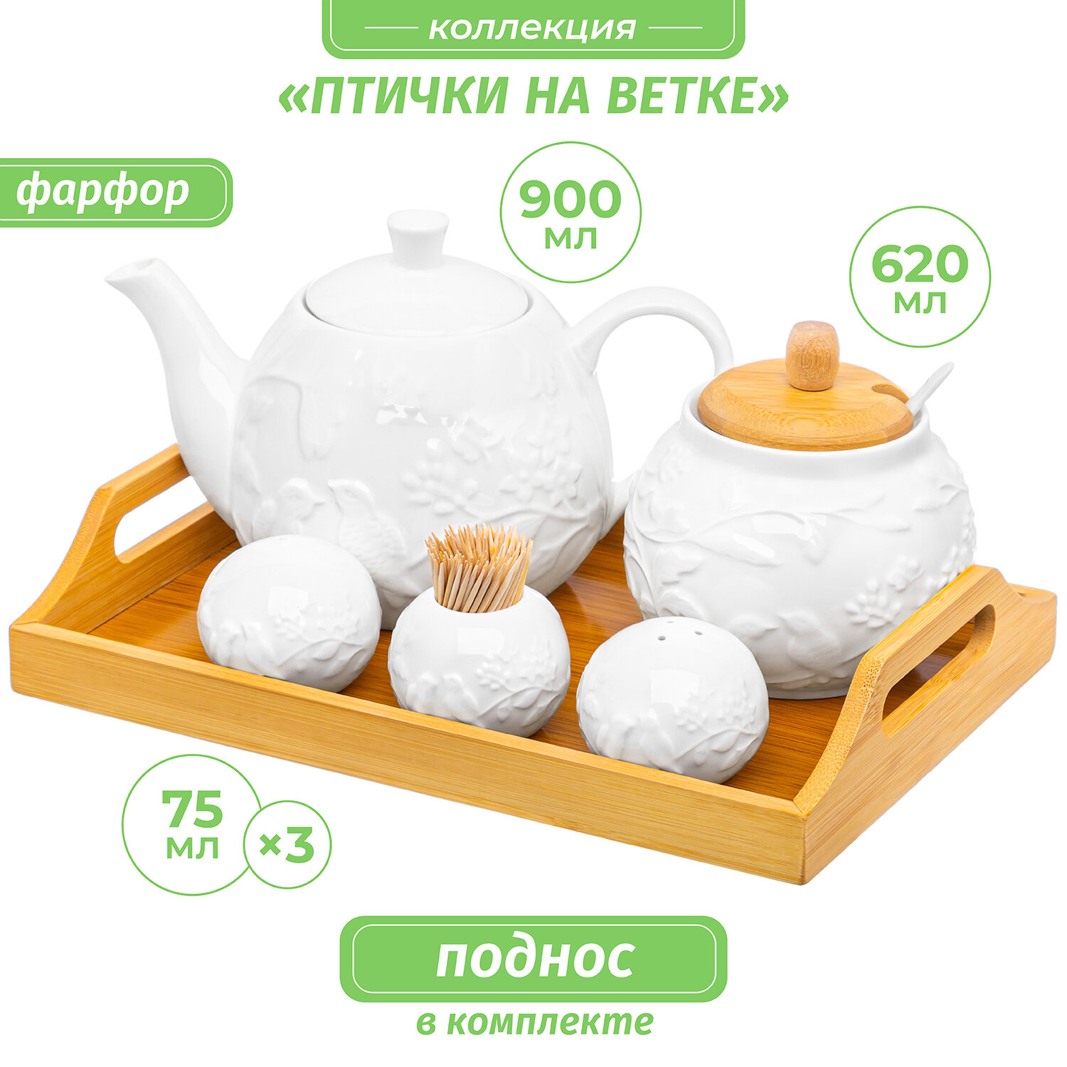 | Дополнительная информация | Набор "Птички на ветке" - чайник 21,5х13,5х13,5 см 900 мл, внутри чайника дырочки в носике, сахарница 12х12х12 см с дер. крышкой и с ложкой, 620 мл, высота без крышки 9 см, вазочка под зубочистки + набор для специй 2 предмета 6х6х5 см 75 мл - каждая, на деревянном подносе с ручками 29,5х20х5,5 см |