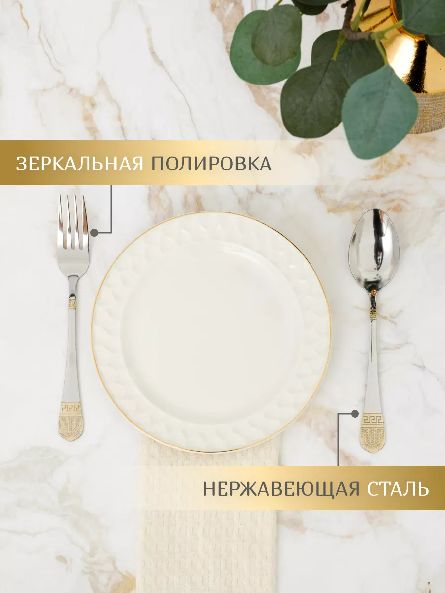 | В набор входит | Ложки столовые - 6 штук Вилки столовые - 6 штук Ложки чайные - 6 штук Ножи столовые - 6 штук |