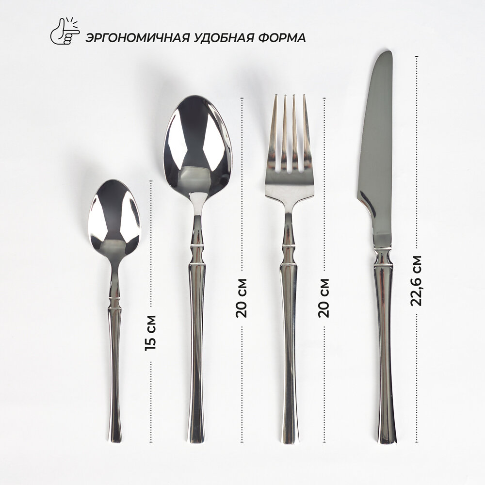 | В набор входит | ложка столовая 20 см - 6 шт; вилка столовая 20 см - 6 шт; нож столовый 22,6 см - 6 шт; ложка чайная 15 см - 6 шт. |