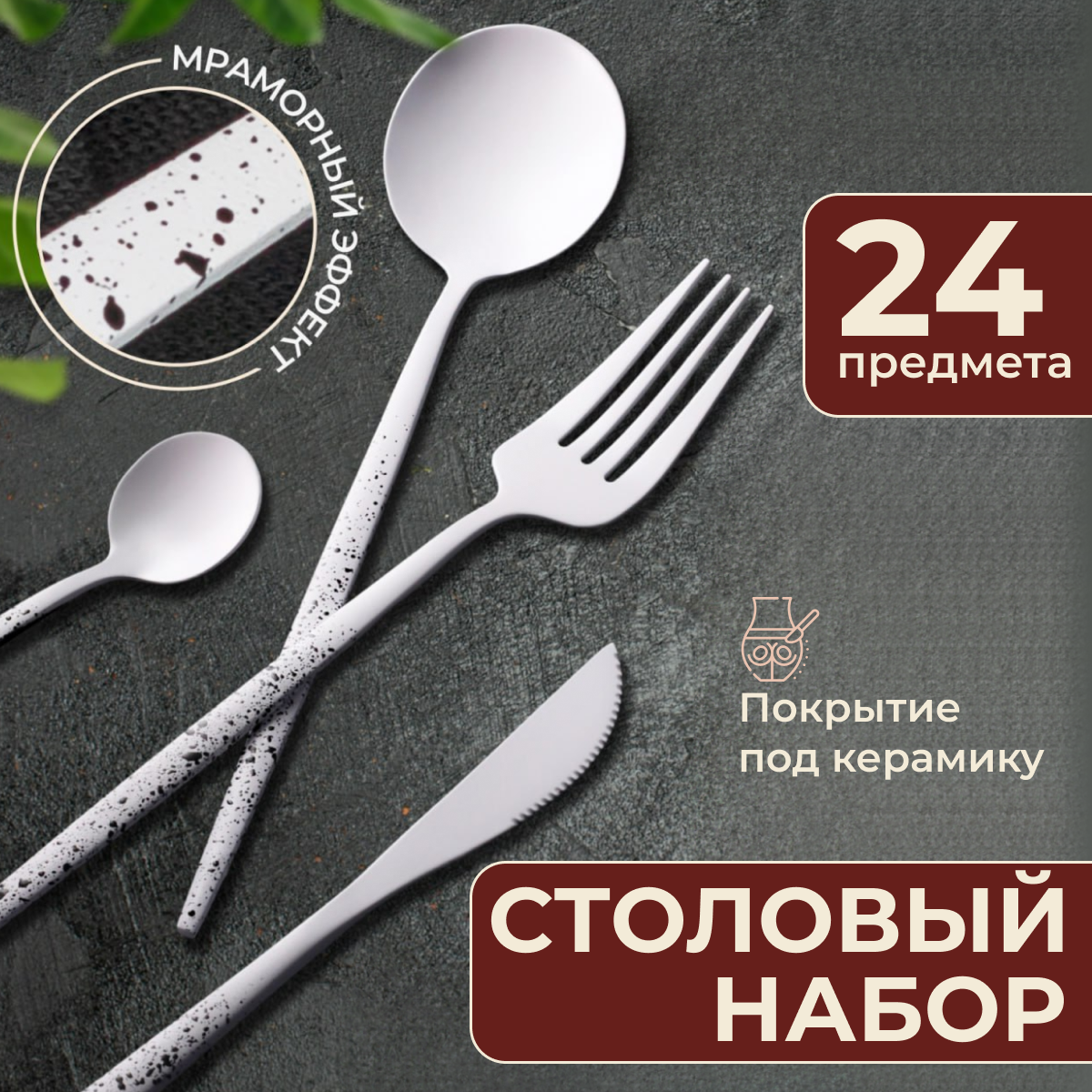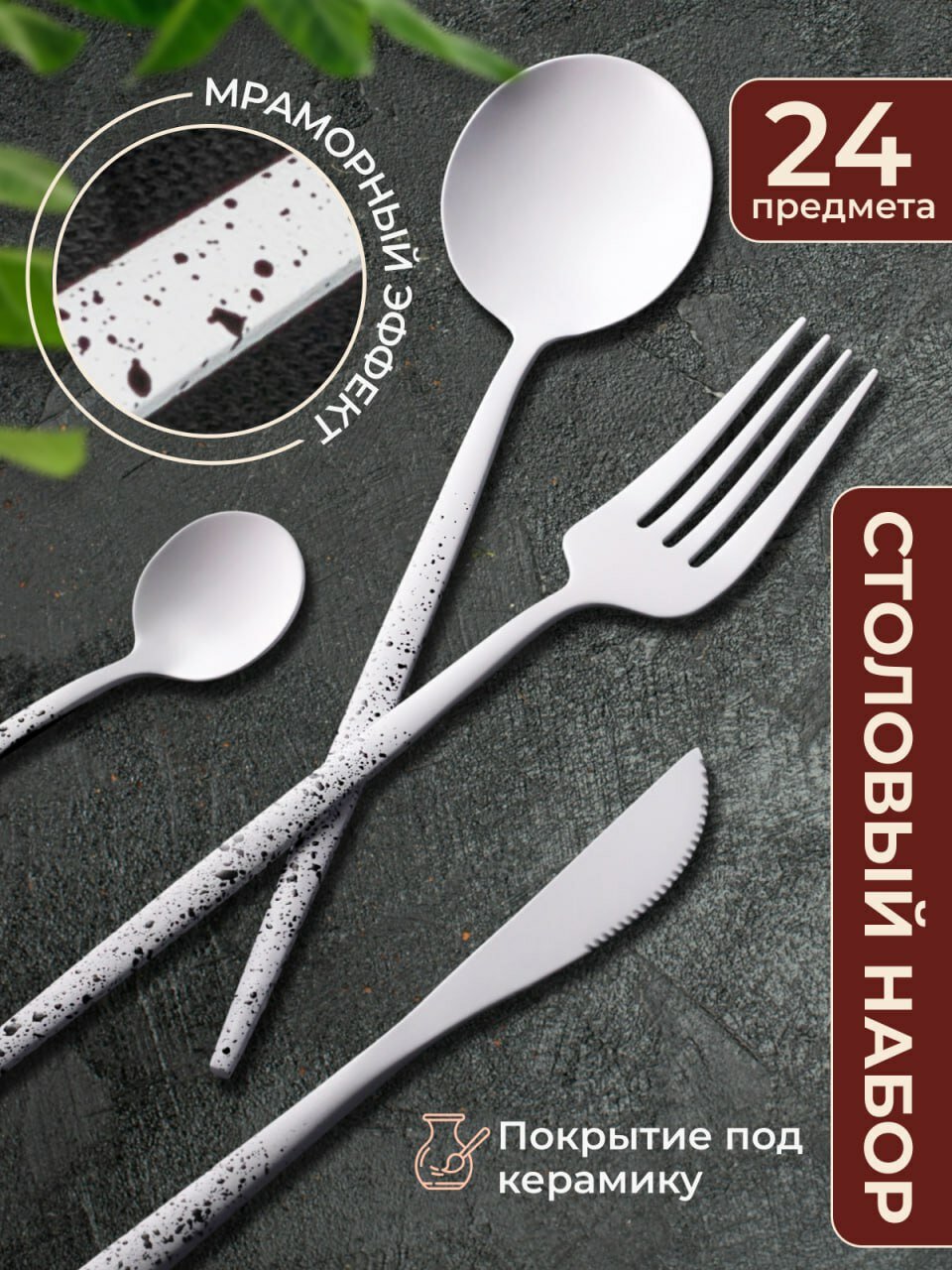 СохранитьНабор столовых приборов, столовый набор на 6 персон, 24 предмета, белые матовые в черную крапинку интересное: