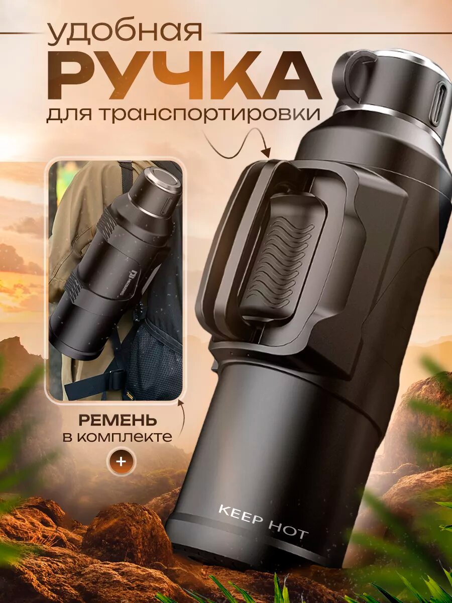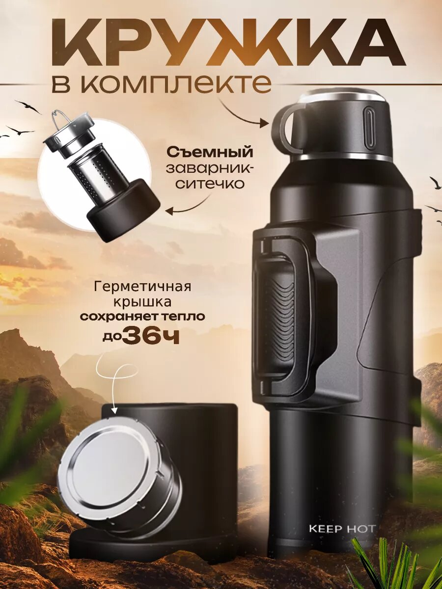 Термос для чая 1.5 литра, туристический, ударопрочный, с ситечком и кружкой, KEEP HOT 1500, черный интересное: