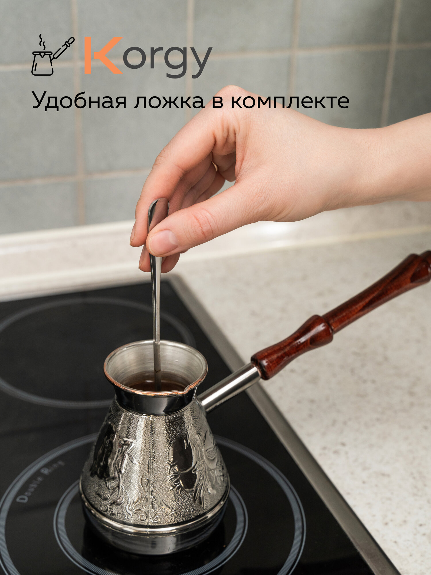 Турка Korgy, медная, для кофе, 600мл, с ложкой, теплоизоляционная ручка