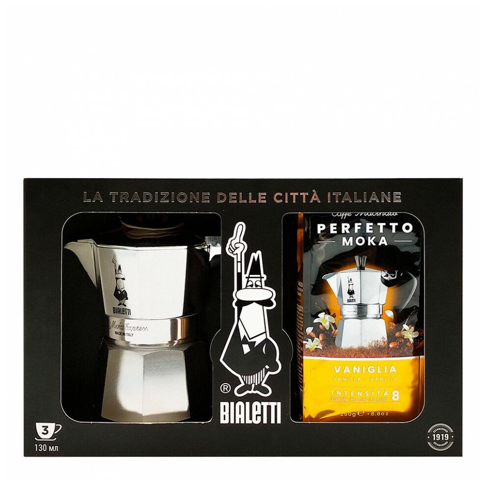 | Комплектация | кофеварка Moka Express,130 мл, кофе молотый Perfetto Moka Vaniglia, 250 г |