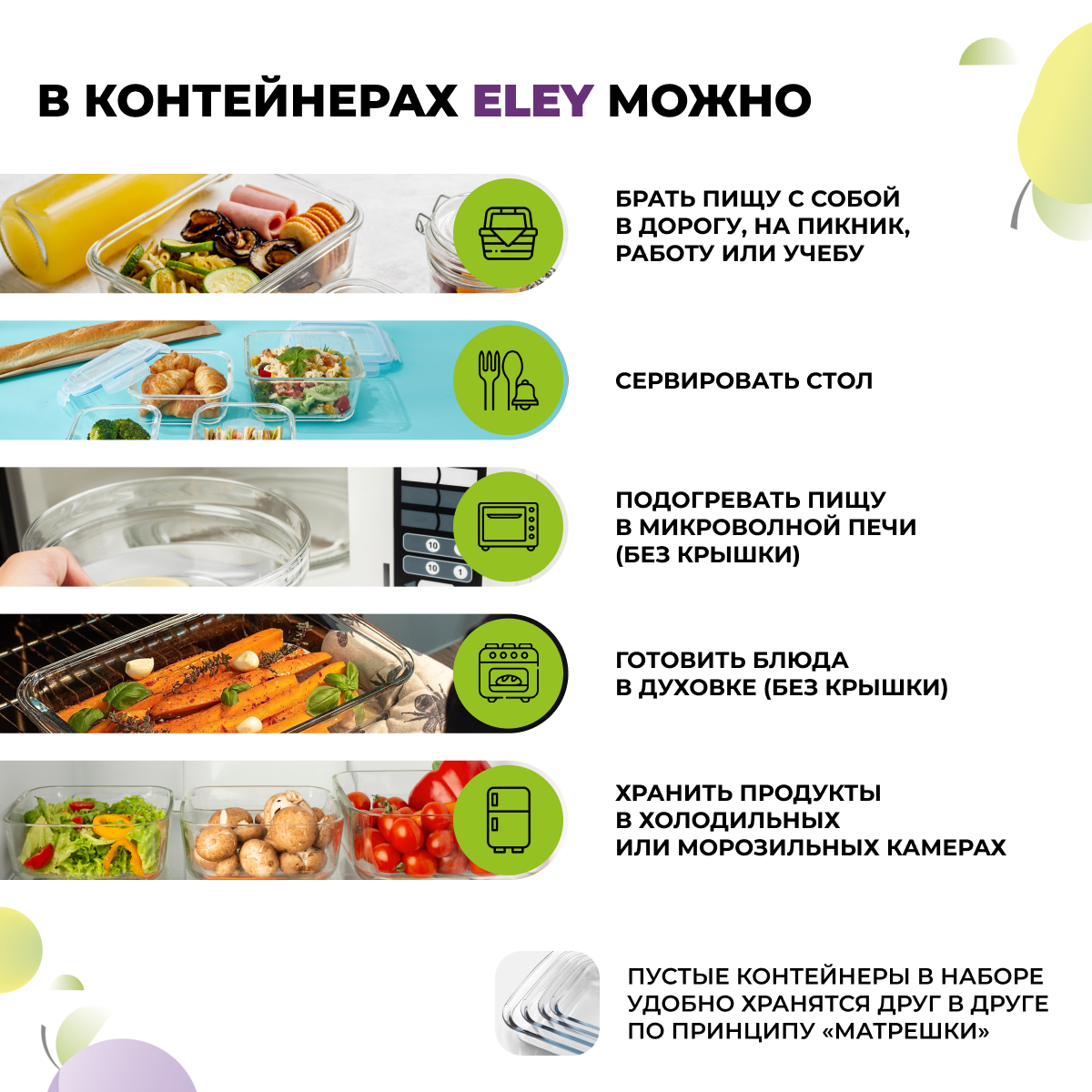 | Особенности | использование для заморозки / можно использовать в свч / можно мыть в посудомоечной машине |