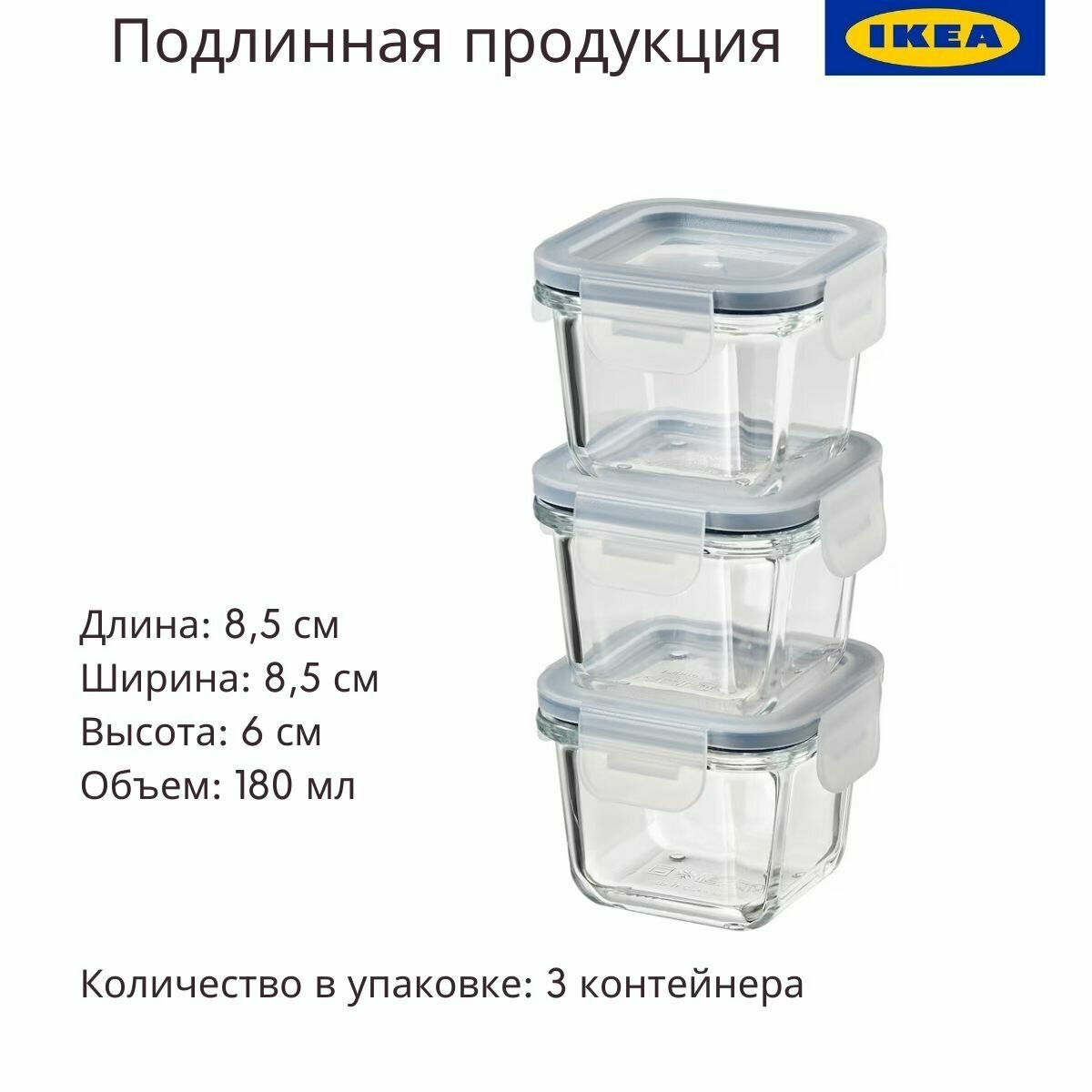 | Комплектация | В набор входит: 3 стеклянных контейнера ИКЕА в заводской упаковке, объем каждого 0,5 л |