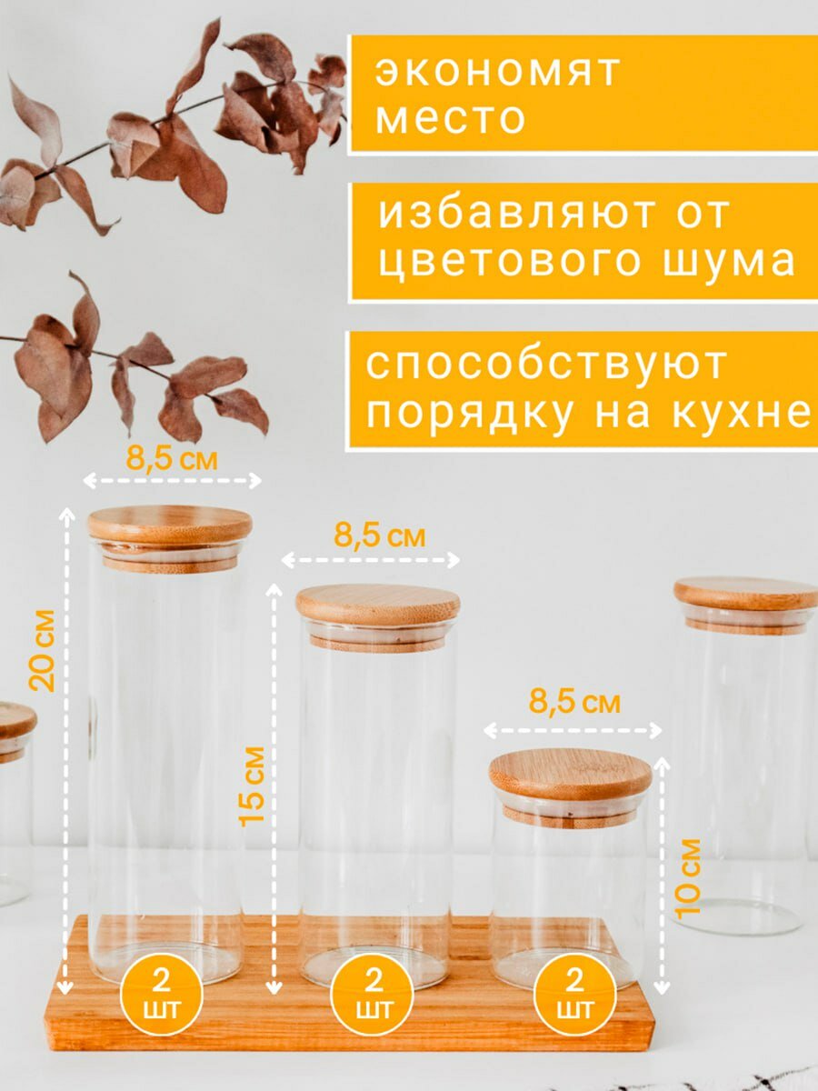 Набор банок для хранения из 6 штук, диаметр 85, емкости для сыпучих, круп, специй стеклянные с бамбуковой крышкой интересное: