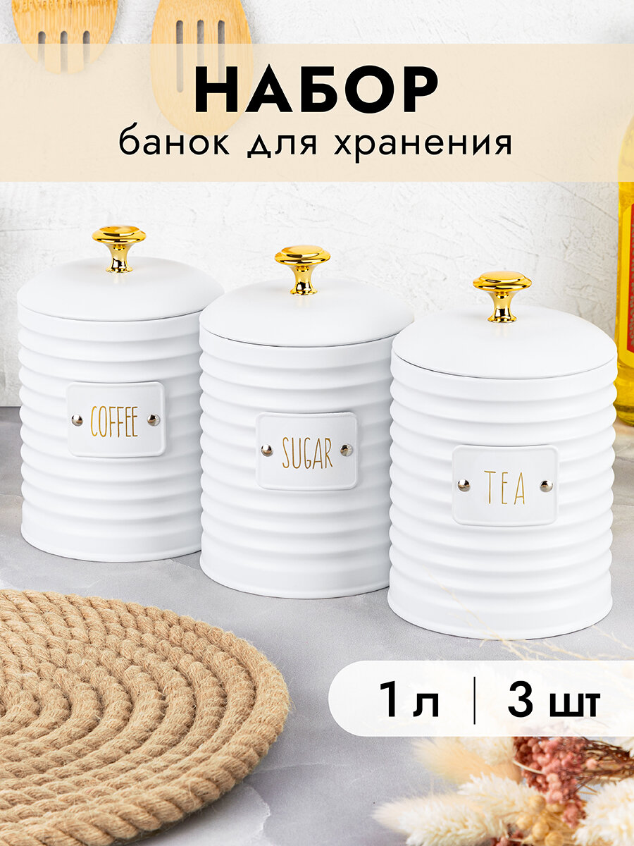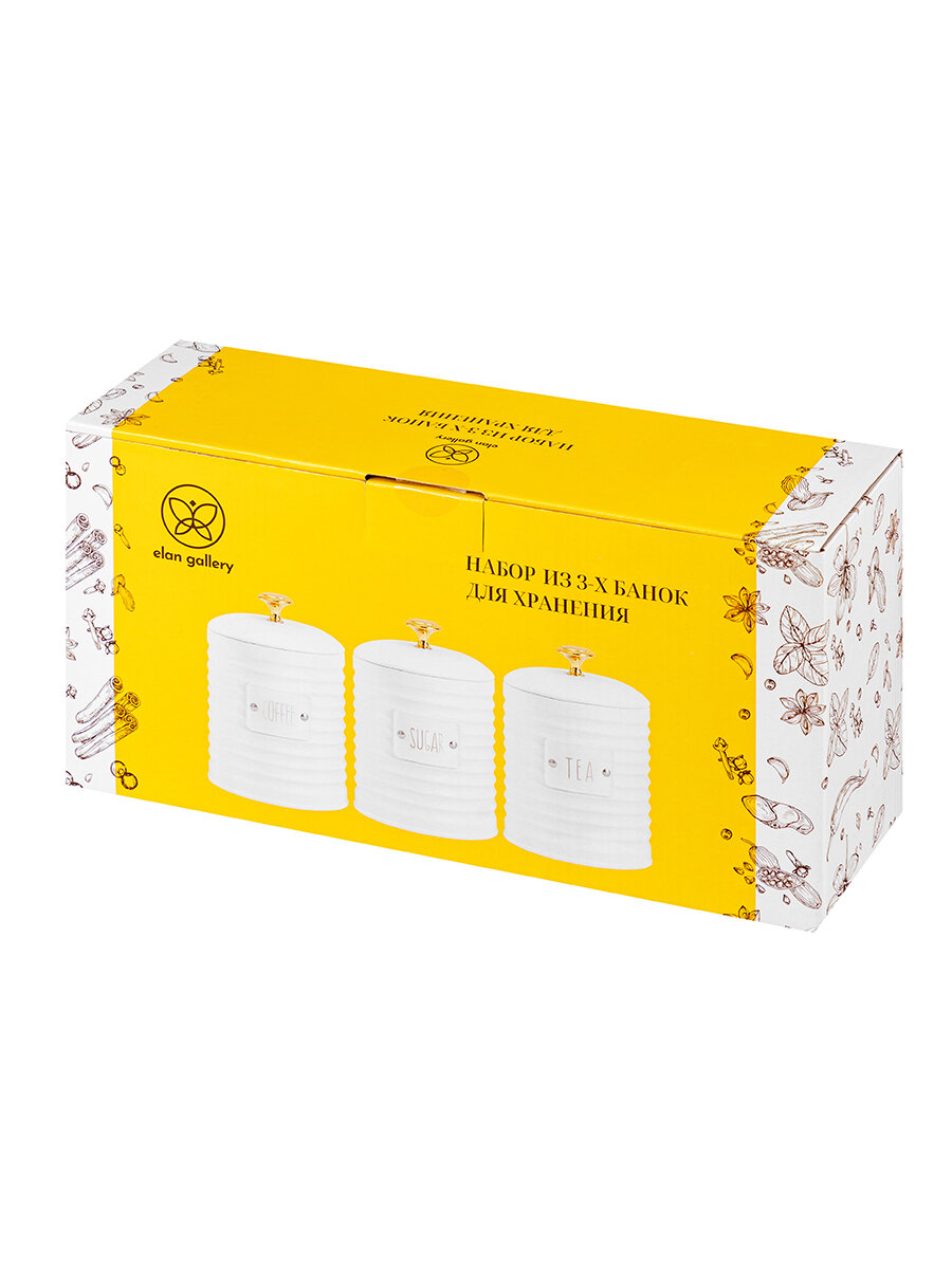 Банка для хранения сыпучих продуктов/ соли/ специй/ чая/ кофе 3 шт Elan Gallery Tea 1 л, coffee, sugar, белый, с крышками с силиконовым уплотнителем, набор интересное: