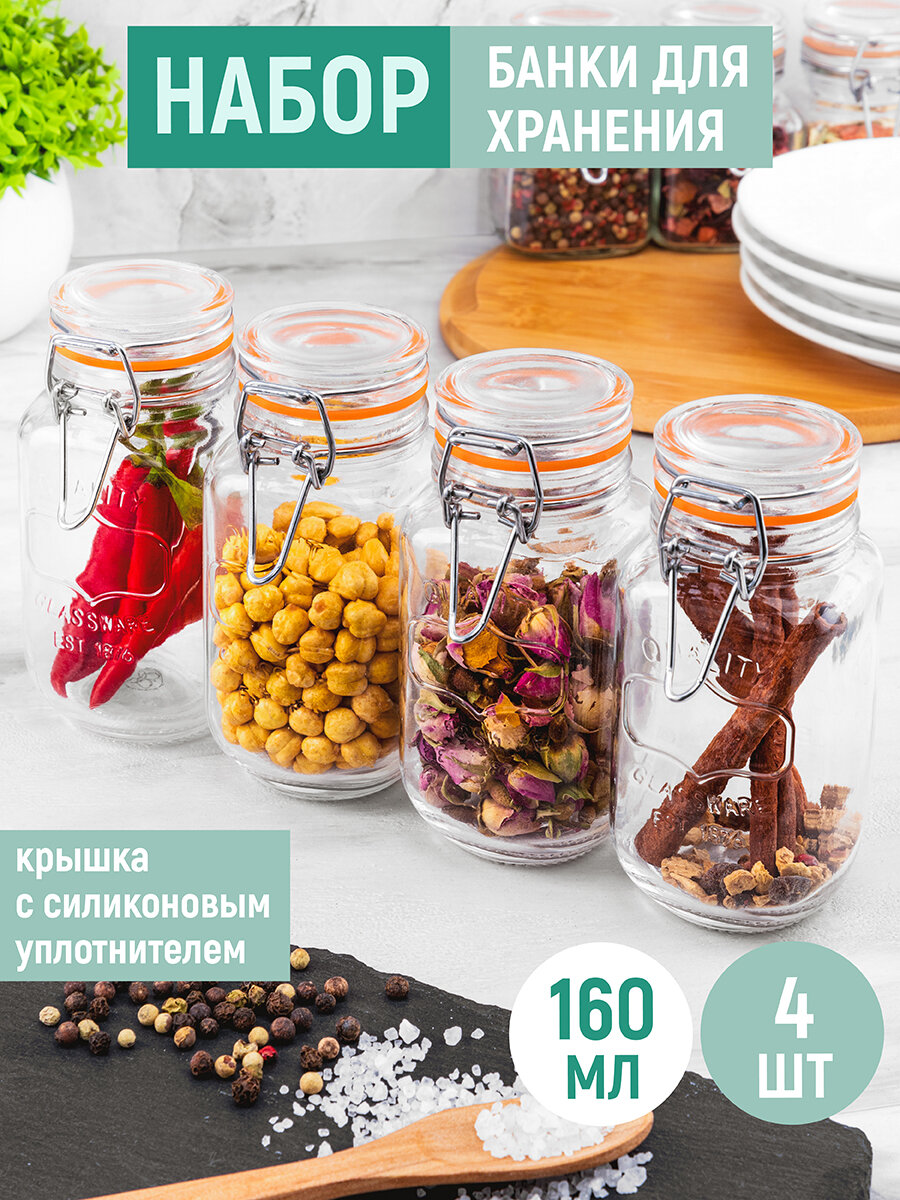 Набор 4-х банок для хранения сыпучих продуктов / специй 160 мл Elan Gallery Glaskraft, с крышками с метал. зажимами и силик. уплот., стеклянные интересное: