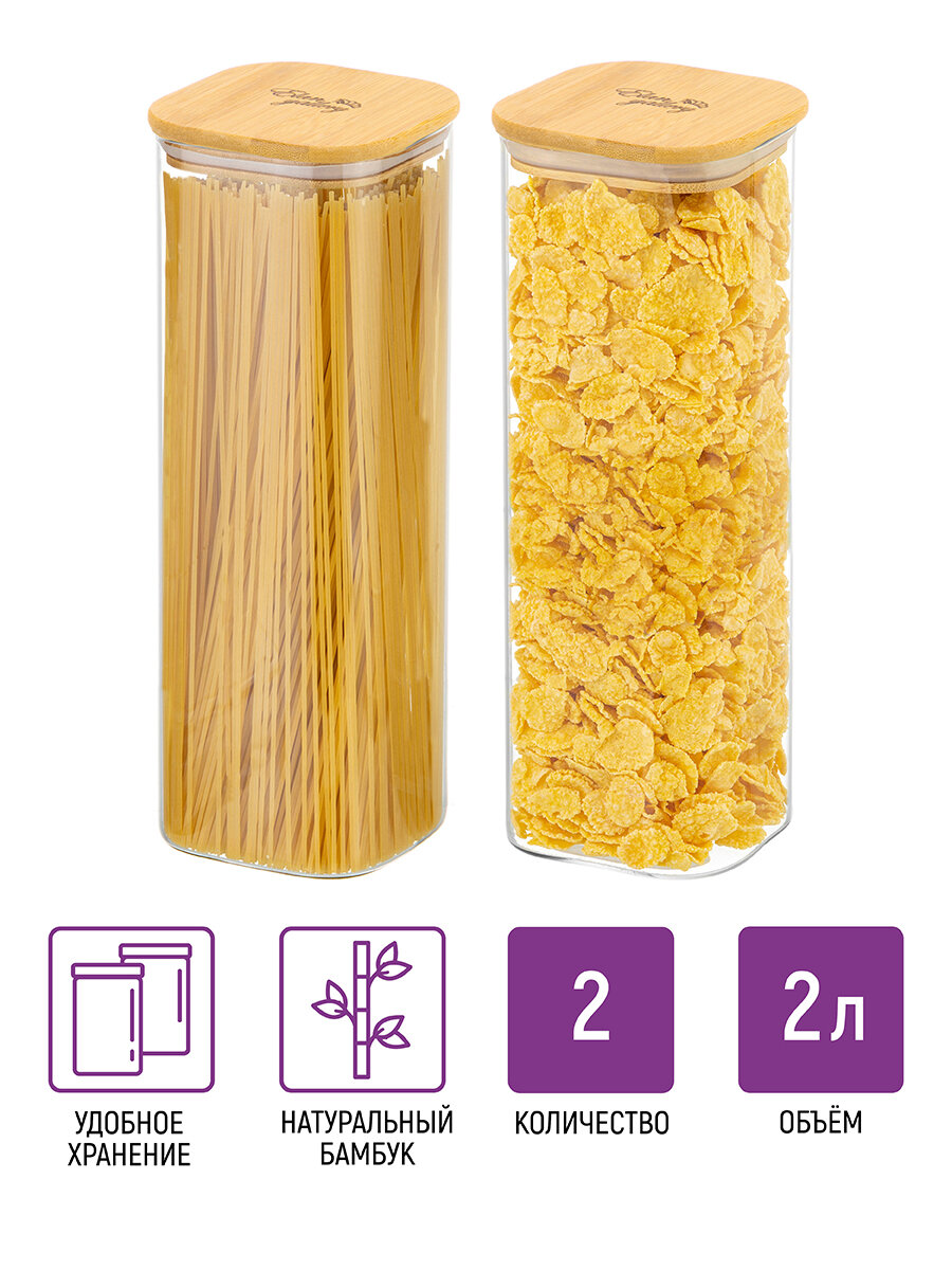 | Дополнительная информация | Банка для хранения "Crystal glass" 10х10х28,5 см, 2 л, с бамбуковой крышкой с силиконовой прокладкой, высота без крышки - 28 см, боросиликатное стекло (2 штуки). Можно мыть в ПММ без бамбуковых частей. |