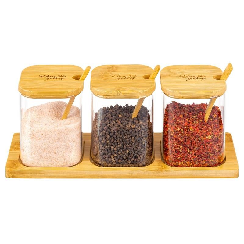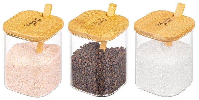 Купить Набор банок для специй 3 предмета Elan Gallery Crystal glass, с бамбуковыми крышками, с ложками, на бамбуковой подставке450 мл 29х9,5х11,5 см