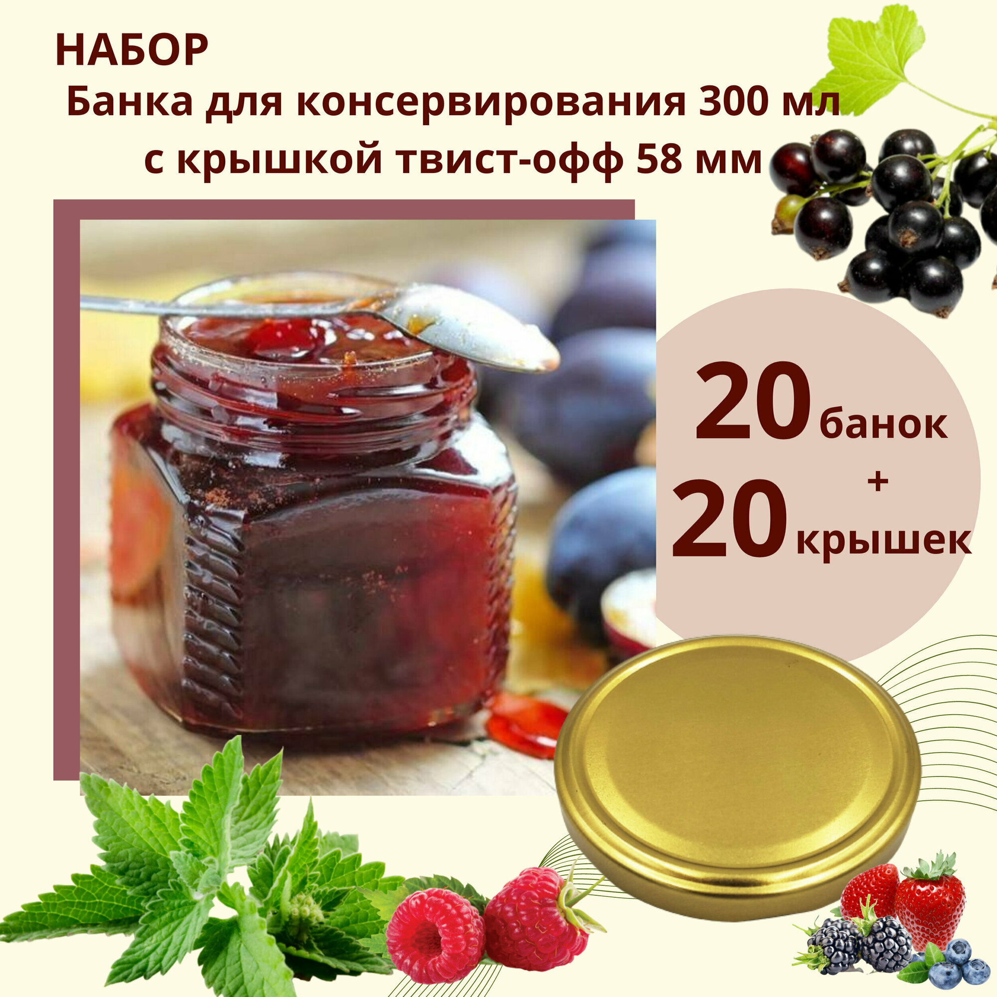 Набор Банка стеклянная для консервирования 0,39 л / 390 мл, 20 штук с золотой крышкой твист-офф 82 мм интересное: