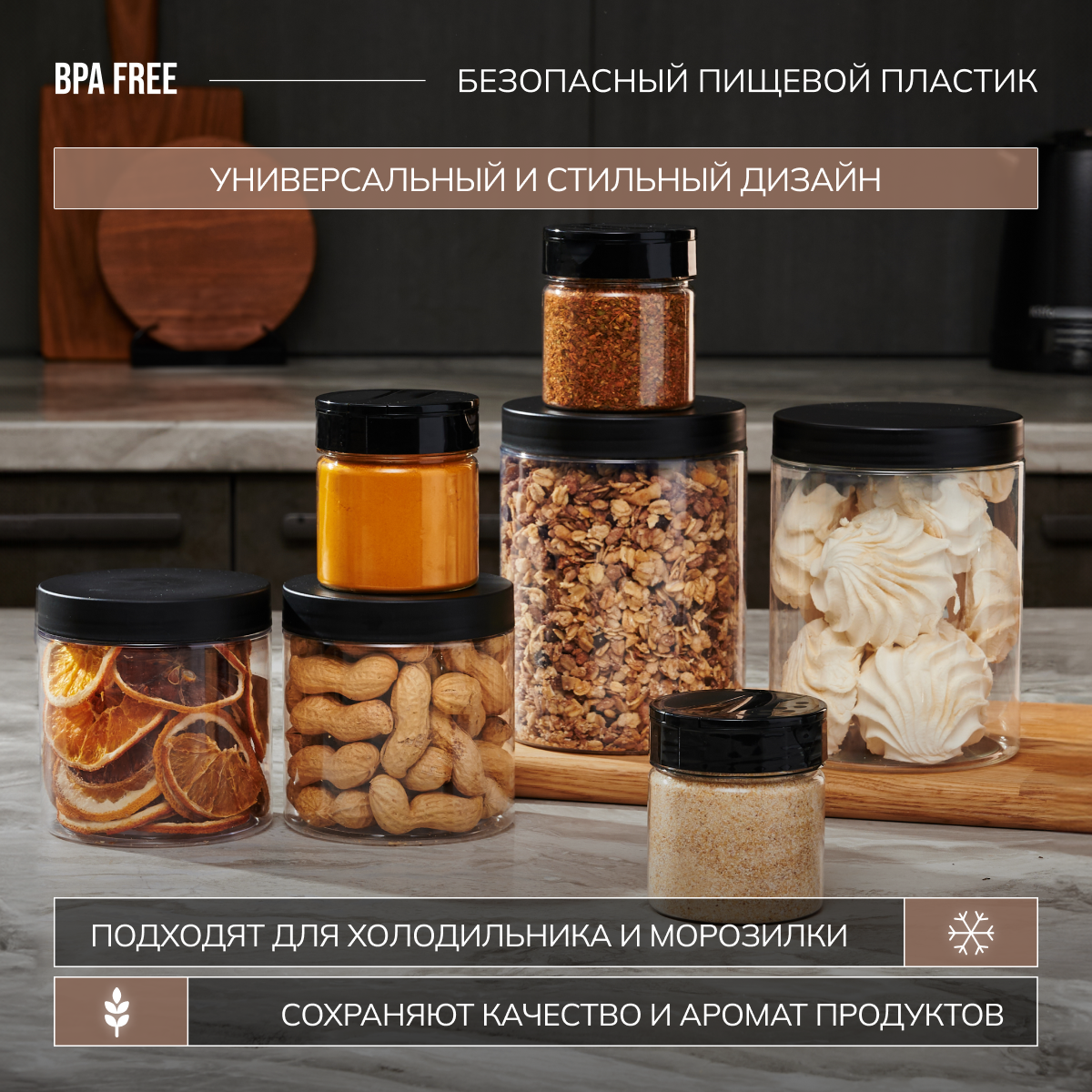 | Дополнительная информация | Набор баночек для порядка на кухне: 7 шт для специй и приправ, 10 шт для бакалеи, 1 шт для спагетти. Баночки позволят убрать визуальный шум , а также вы всегда будете знать какой продукт в каком количестве. |