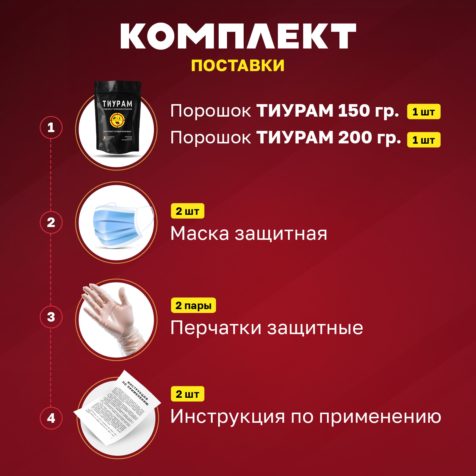 | Подробная комплектация | тиурам, перчатки одноразовые, маска защитная |