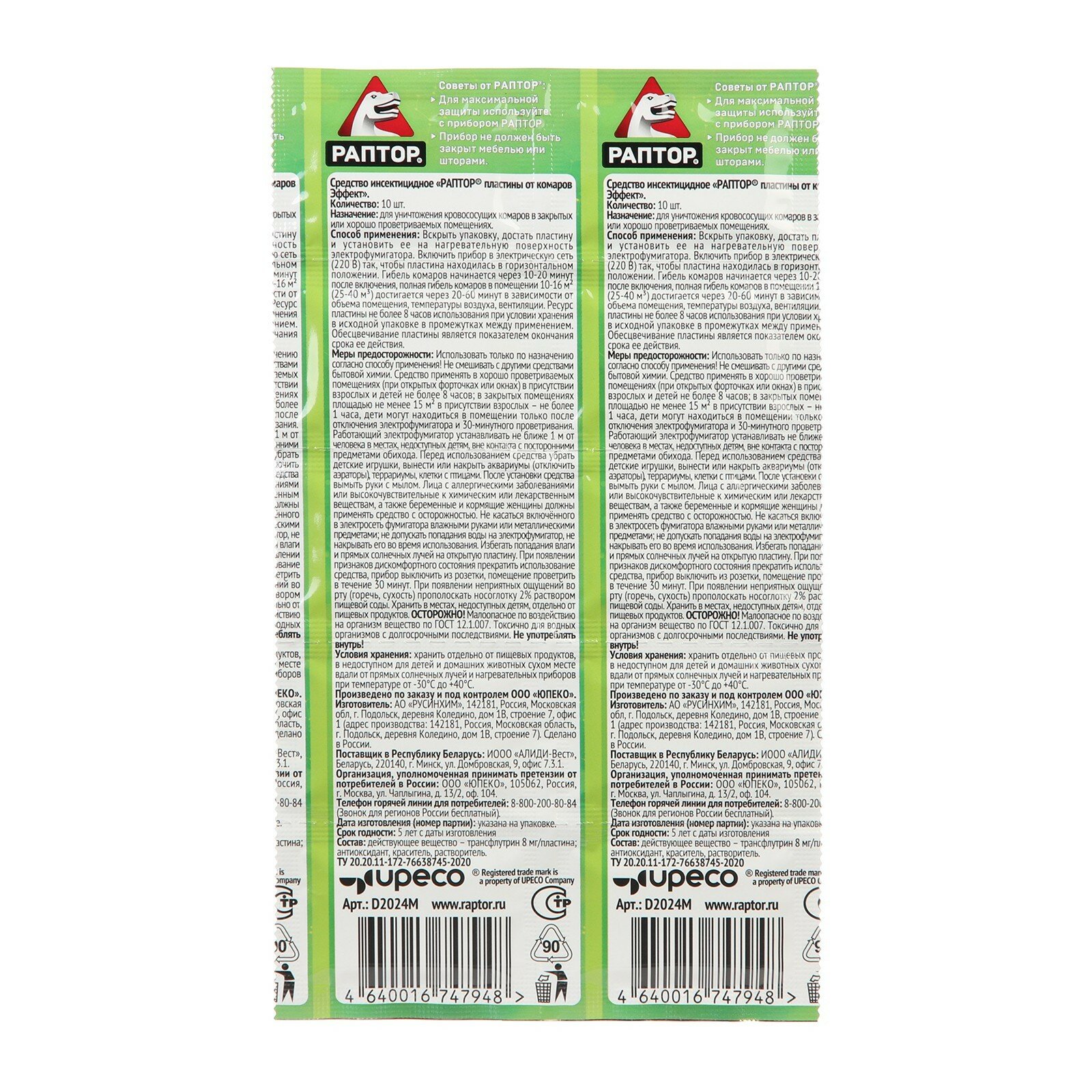 | Способ применения | Эффективное и безопасное средство,обеспечивающее надежную защиту от комаров втечение 8 часов• В состав пластин входит высокоэффективноедействующее вещество etoc®, разработанное японской корпорацией SUMITOMO |