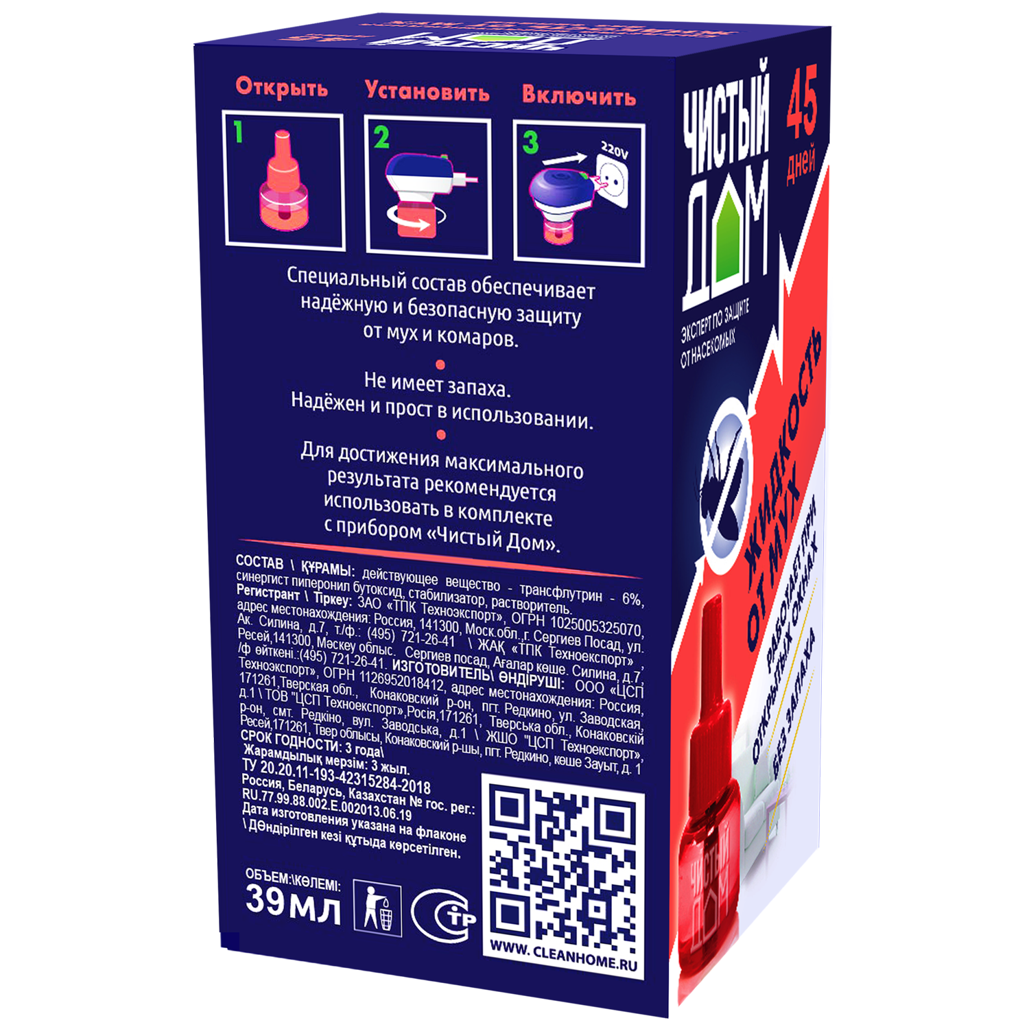 | Способ применения | достаньте из коробки флакон с жидкостью от мух, открутите защитный колпачок; вставьте флакон в прибор «Чистый Дом» и плотно прикрутите; включите прибор в электросеть (220Вт, 50Гц), поверните вилку прибора так, чтобы флакон располагался вертикально |