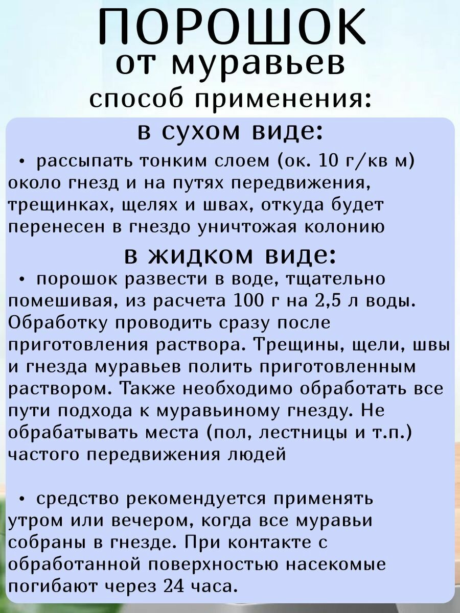| Способ применения | в виде порошка: порошок рассыпать тонким слоем (ок. 10 г на 1 м²) на гнездо и на пути следования муравьев (т.е на муравьиных дорожках), на трещинах, щелях и швах, откуда он будет перенесен в гнездо, уничтожая колонию; в виде раствора: порошок развести в воде, тщательно помешивая, из расчета 100 г на 2,5 л воды, обработку проводить сразу после приготовления раствора; трещины, щели, швы и гнезда муравьев полить приготовленным раствором; также необходимо обработать все пути подхода к муравьиному гнезду; не обрабатывать места (пол, лестницы и т.п.) частого передвижения людей |
