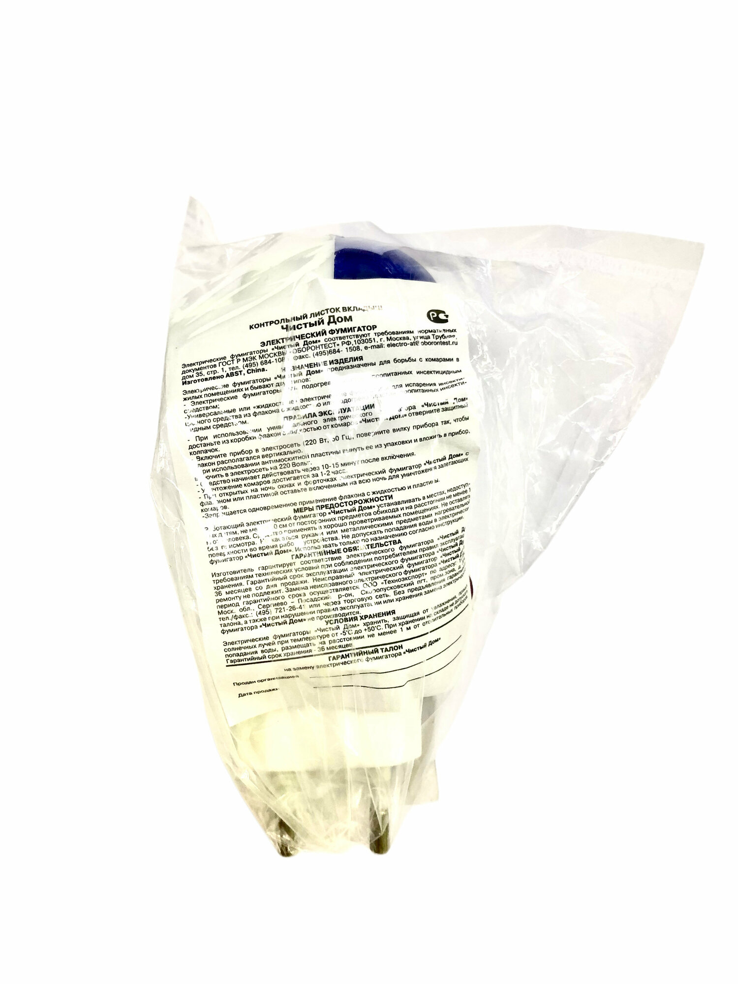 | Дополнительная информация | Меры предосторожности. Работающий электрический фумигатор Чистый Дом устанавливать в местах, недоступных детям, не менее 50 см от посторонних предметов обихода и на расстоянии не менее 1 метра от человека. Средство применять в хорошо проветриваемых помещениях. Не оставлять без присмотра. Не касаться руками или металлическими предметами нагревательной поверхности во время работы устройства. Не допускать попадания воды в электрический фумигатор Чистый Дом. Использовать только по назначению согласно инструкции. |