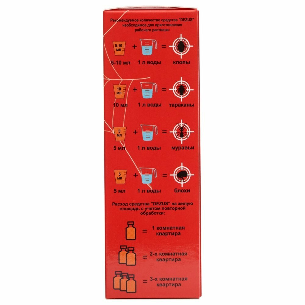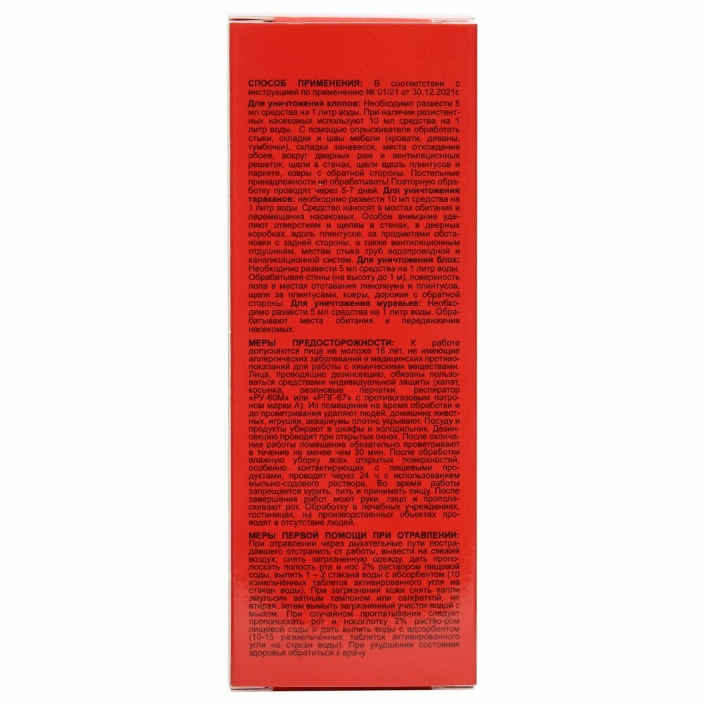 | Способ применения | Для уничтожения клопов, блох, муравьев нужно развести 20 мл средства на 1 л воды. Для уничтожения тараканов 30 мл на 1 л воды. Обрабатывать необходимо с помощью опрыскивателя. Против клопов обрабатывают щели в полу, щели за плинтусами, внутри мебели, кровати, дивана, под матрасом, щели за потолочными плинтусами, в паркете, в местах отставания обоев, дверные рамы и т.д. Постельные клопы прячутся в щелях и стыках, поэтому чем тщательнее вы обработаете места обитания и перемещения клопов, тем лучше будет ваш результат. Обработку проводить при открытых окнах в средствах индивидуальной защиты. После обработки необходимо закрыть помещение на 3-4 часа. По приходу провести влажную уборку. Результат будет виден сразу после обработки. В течении недели вы можете заметить как клопы будут выходить из своих укрытий. Рекомендуем через неделю повторить обработку. Соблюдайте меры предосторожности согласно инструкции, подробная инструкция приложена на фото в карточке товара. |