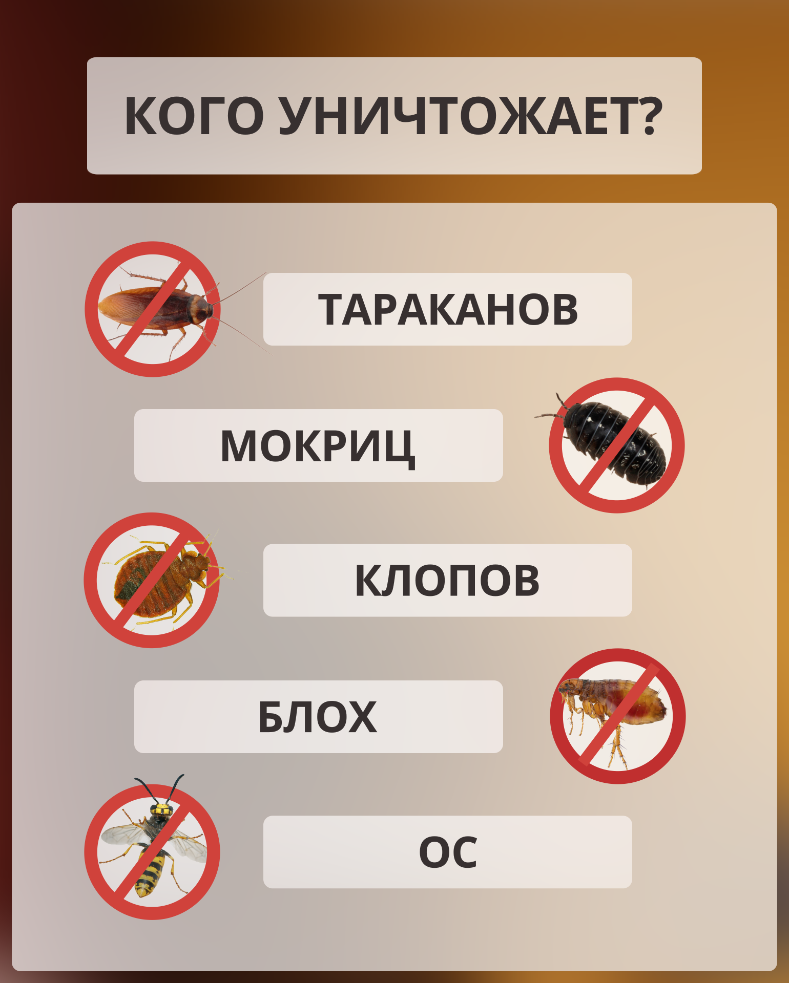 | Вид насекомых | блохи / клещи / клопы / кожееды / комары / мошки / муравьи / мухи / пауки / ползающие насекомые / постельные клопы / тараканы / чешуйницы |