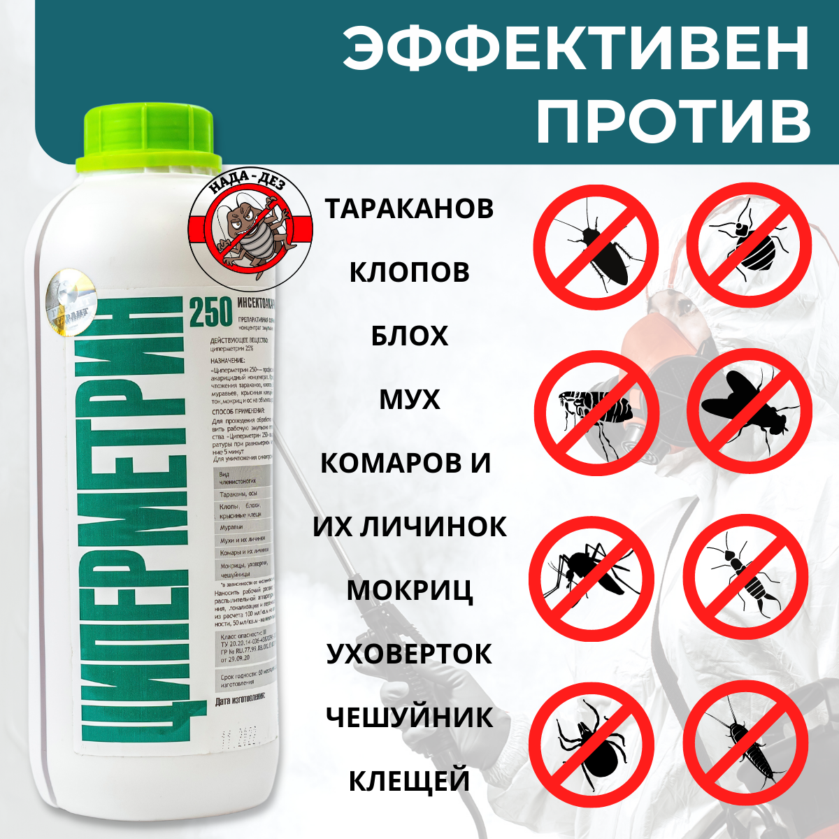 Циперметрин 250 средство от клопов, тараканов, блох, муравьев, мух, комаров, клещей, 50 мл